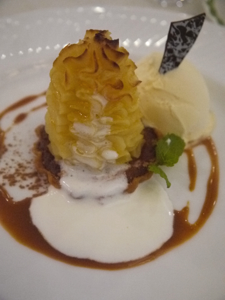 しっとりタルト生地に、スイートポテトを高く盛っている。バニラアイスとキャラメルソースが添えられてあった。