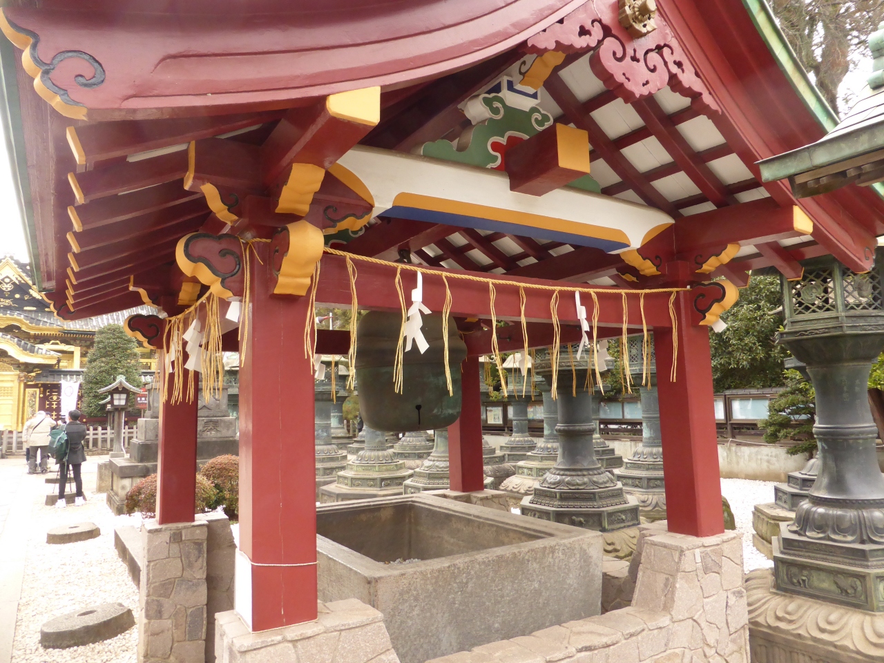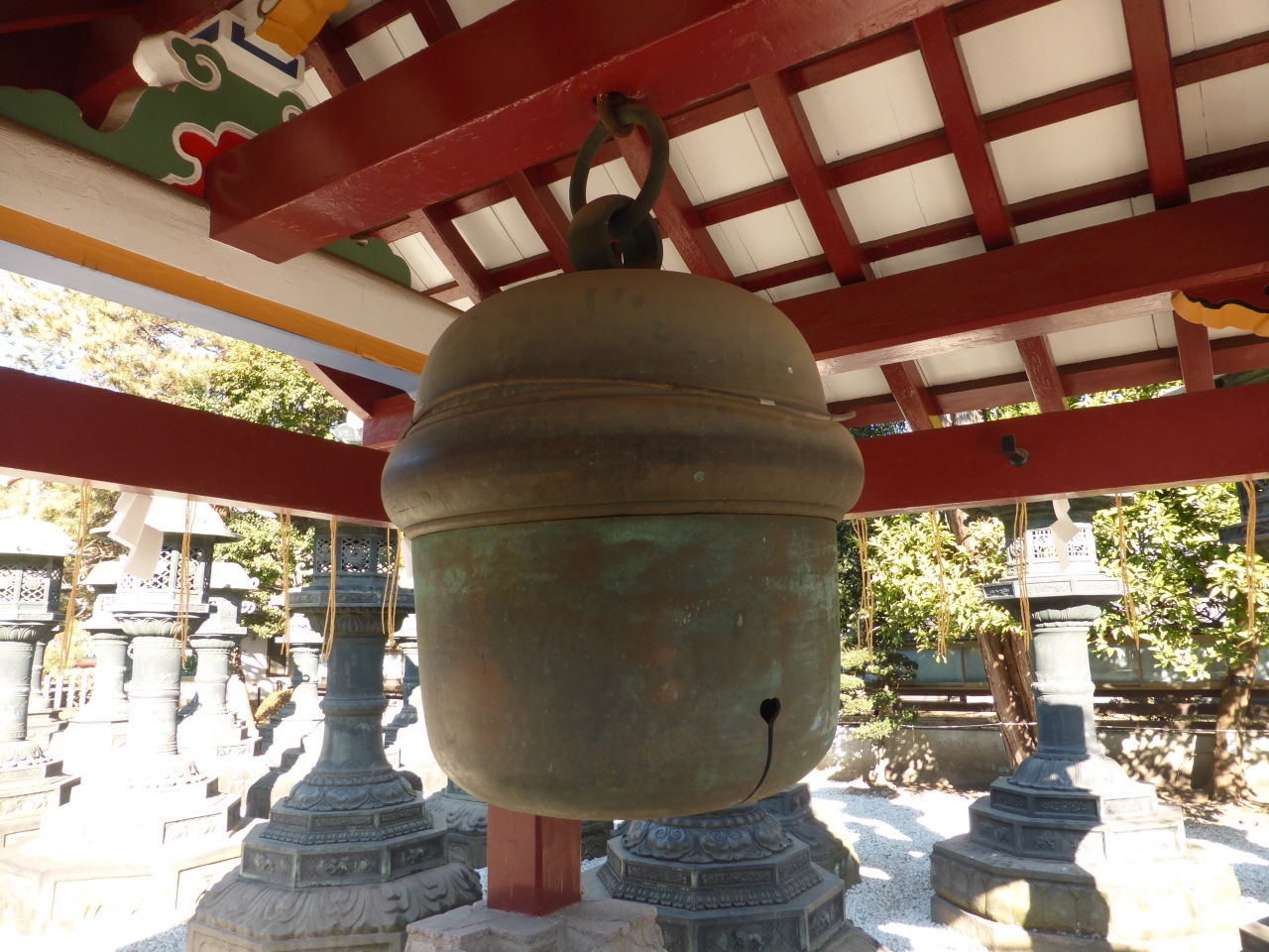 参道にある水舎の前にあるのが水屋。ここに飾られている大きな鈴が目に付きます。これは狛犬の石工、酒井八右衛門寄進の鈴。来歴は不明であるが、昭和30年頃珍品であるため人目につくろころにと、この水屋に付けられたそう。なぜここにという疑問は残りますが、こういうおおらか時代もあったという事で納得。ただ少々錆や埃が溜まっているようなので、もう少しきれいな状態で見たいですね。水屋自体も色鮮やかで目立つので、見逃さないように。