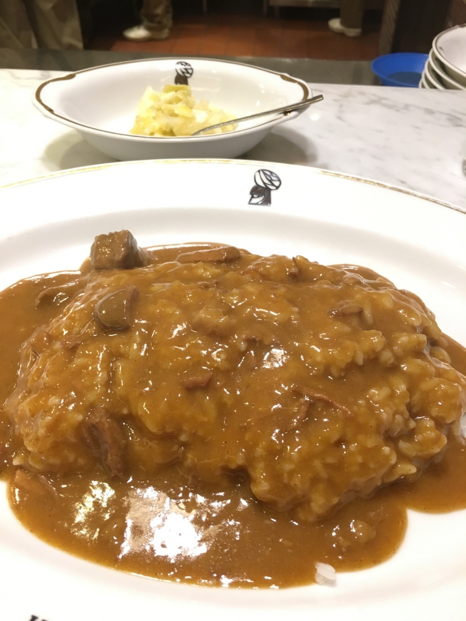 フェスティバルホール地下1階にあるカレー屋さんです。カウンターのみなので一人でも入りやすいです。私はカレースパゲッティ、連れはカレーライスにしました。スパゲッティは昔の喫茶店の麺っぽくて、懐かしい感じです。どちらもとても辛いですが、クセになる味で美味しいです。もし辛いのが苦手だったら、ハヤシライスなどもありますよ。