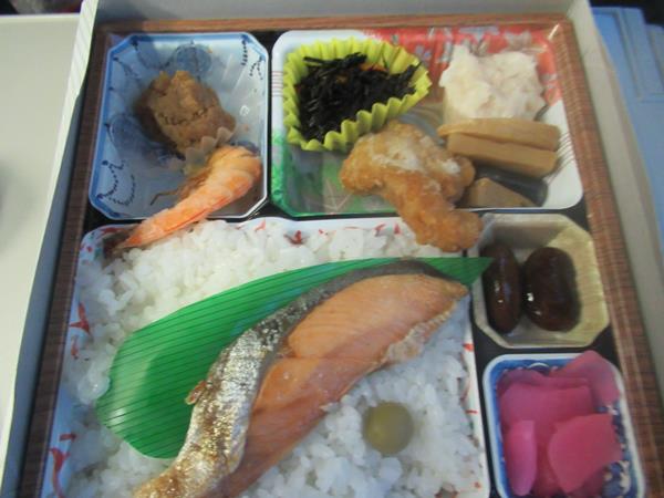 焼き鮭が真ん中にドーンと載った幕の内弁当はおかずの種類も豊富でした。
