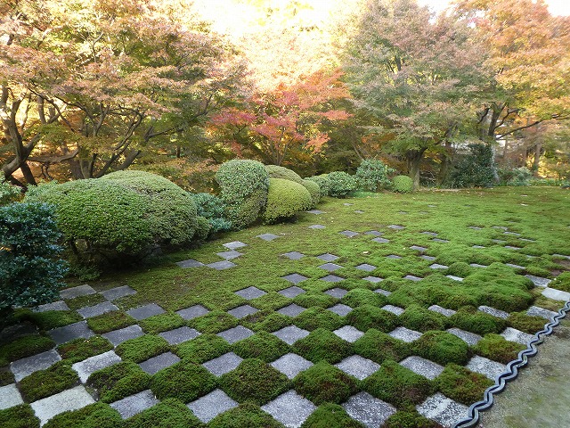 紅葉の名所、東福寺。秋のシーズンだと紅葉に圧倒されてしまいますが、本坊庭園もなかなかユニークです。お坊さんたちの住居である方丈の四方ぐるりにそれぞれ趣の異なる庭園があるのです。南庭は、砂紋の中に石を置いた、日本庭園ではよくあるパターンになってました。面白いのは北庭です。切石と苔を交互に並べ市松模様になってました。由緒あるお寺では、なかなか見かけない造りです。近代の造園家、重森三玲が1938年に作庭。比較的、最近の造りということもあるんでしょうね。