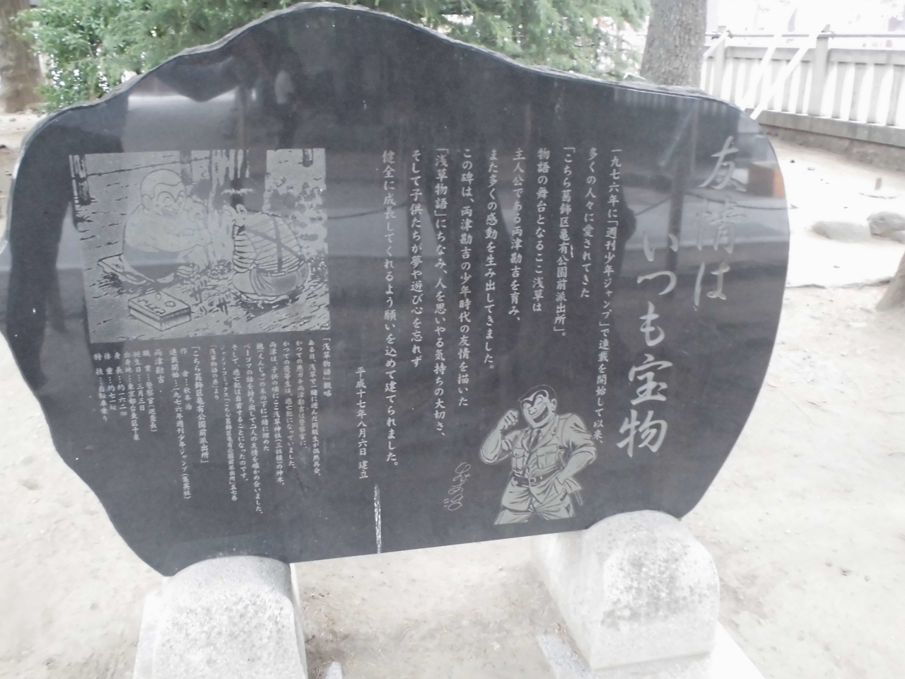 浅草も舞台の1つであるこち亀。その碑が浅草にありました。「浅草物語」という本作でも有名な作品の1コマも碑に掘られています。両津の若かりし頃の姿も書かれているのいうのは珍しいですし、何よりも1つのエピソードを碑にしてしまうというのもこの作品の偉大さを表しています。