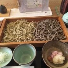 今回は辛おろし板そばの外一細と十割太の相盛りを大盛で注文。
