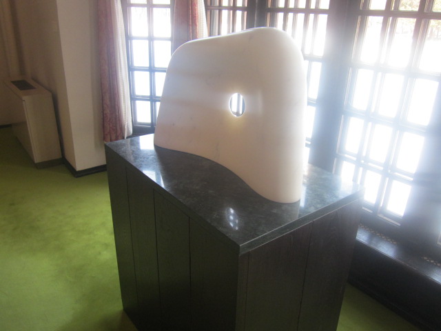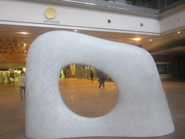 実際に比較してみると、勿論、大きさはサツエキの作品の方が圧倒的に大きいのですが、知事公館のと比較すると、単純に大きくなっただけではなく、真ん中の穴の部分が明らかに大きく表現されていました。サツエキは人が多く往来する場所ですし、意図的にこの真中の穴を大きくして、先がよく見通せるようにしたのかな、等と想像を逞しくしながら、興味深く眺めることが出来ました。是非、皆様も両作品の比較を楽しんでみて下さい。因みに、どちらも同じ「妙夢」というタイトルの安田侃(やすだ かん)氏(美唄出身;現在は北イタリアで活躍中)の作品となっています。
