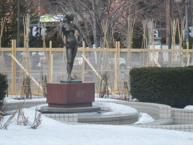 大通公園の西端にある像として、公園リピーターの方にはかなりお馴染みの像ですが、ここはバラ園の冬囲いが施されている間は、直近まで近づくことが出来ません。
