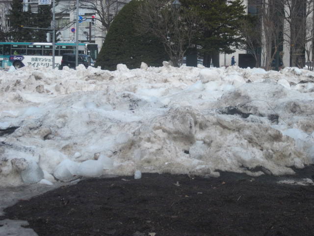 その約1か月前に、大通東側の地下通路沿いにある500m美術館で、雪捨て場をテーマにした写真展みたいなのが開催されていて、そういう見方もあるのだなあと、その時は軽く見過ごしていたのですが、今回、その視点が強く印象に残った状態で、春先の大通公園を歩いてみると、なるほど、それぞれの雪山の”腐り具合”等の微妙な違いなどが、ある意味絵画的な風情で次々と展開される感じで、とても新鮮に感じました。