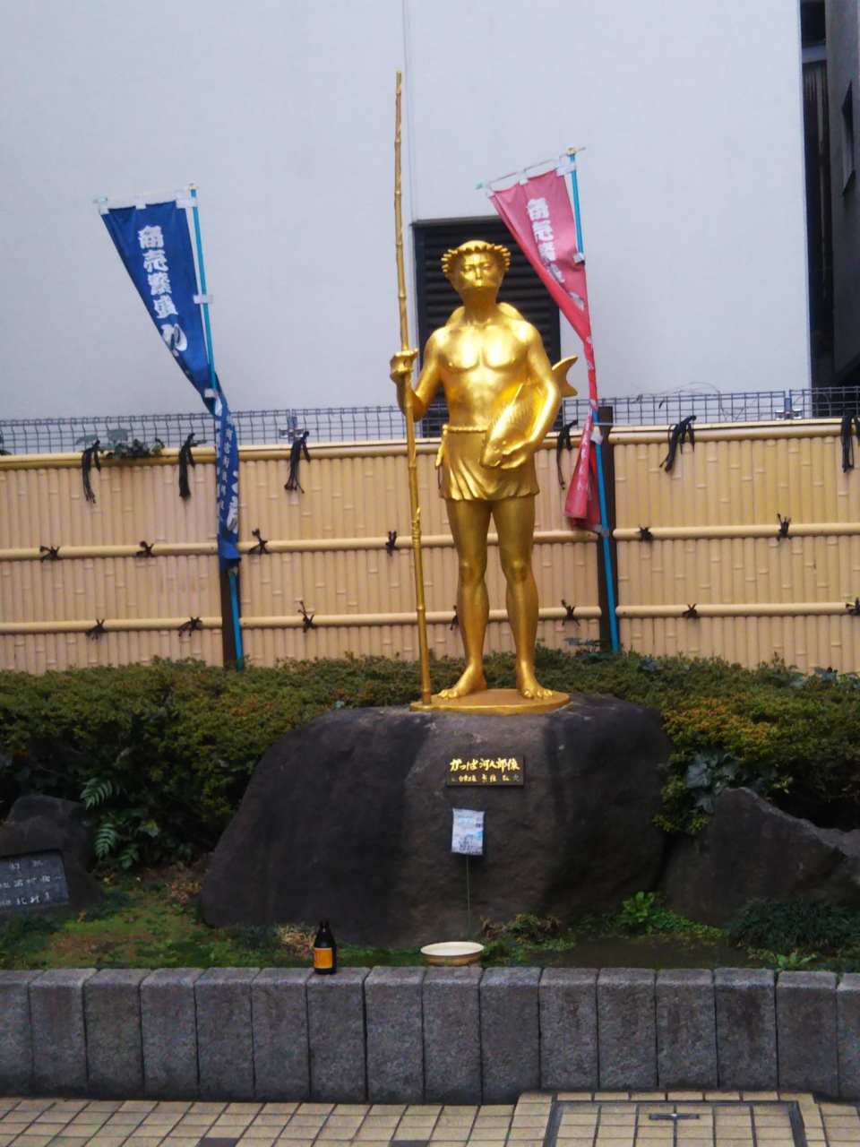 東京の人気観光スポット、浅草にあるみどころスポットです。プロの調理道具がそろう問屋街、合羽橋道具街にあるかっぱの像です。キャラクターがかっぱですが、河太郎は金色にかがやいています。商売繁盛のご利益がいかにもありそうな姿でした