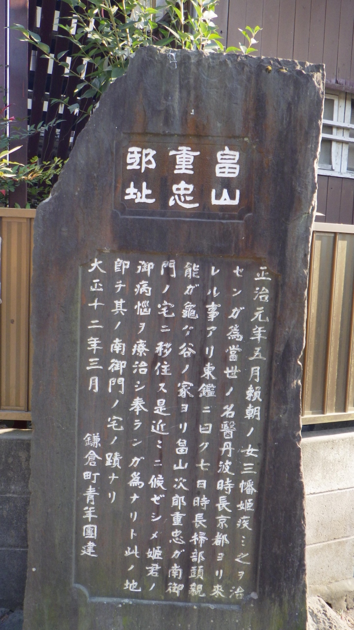 石碑に刻まれている内容は難解なので調べてみると、源頼朝挙兵から鎌倉幕府創設まで多大な貢献を果たした伝説の武士でこの地に重忠の南御門宅あったとの事です。