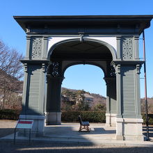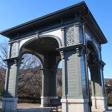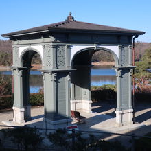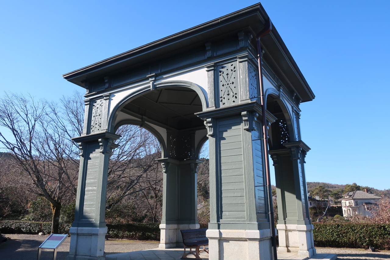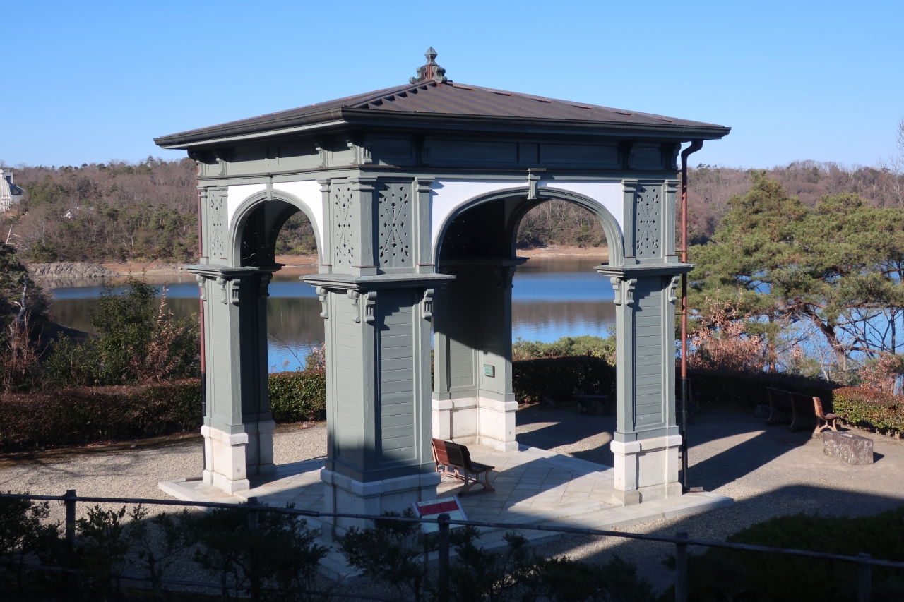 明治村3丁目の入鹿池を望む場所に宗教大学車寄があります。明治41年に巣鴨にあった宗教大学(現大正大学)本館の車寄として作られた建物ですが、現在は建物の下にベンチが置かれ東屋の様にしか見えません。言われてみると東屋にしては大きく、本館が残っていないのは残念に思いました。