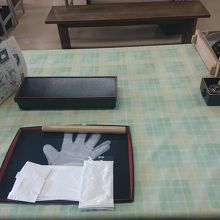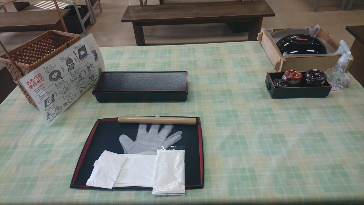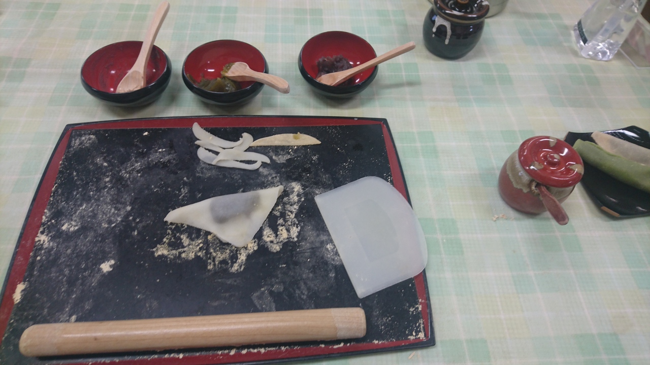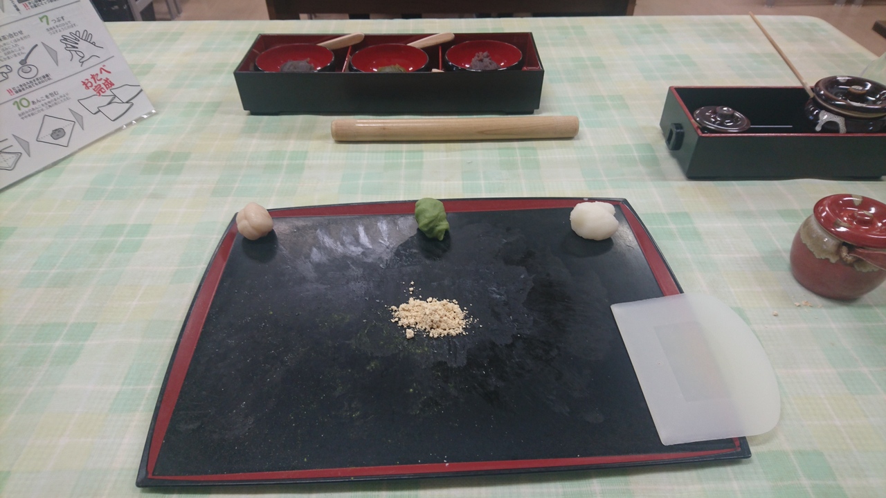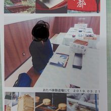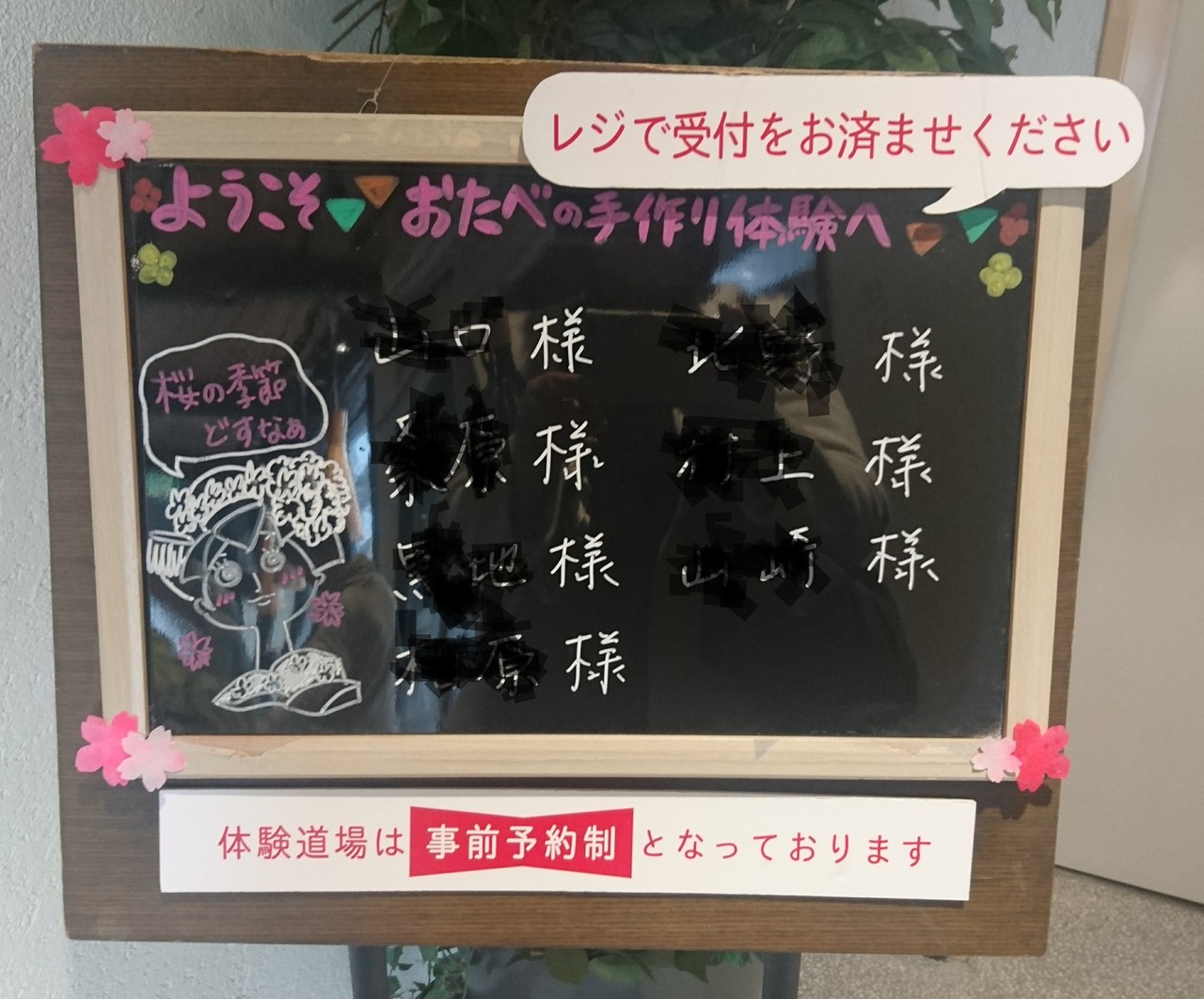 おたべ体験に参加!ウェルカムボードあり。材料も全てテーブルごとに揃っていて説明もとてもわかりやすい。生地を蒸している間(約15分)の間にはガラス越しにおたべを作っている工場を見学。おたべは柔らかい為、箱詰めは人の手作業だったのが驚いた。