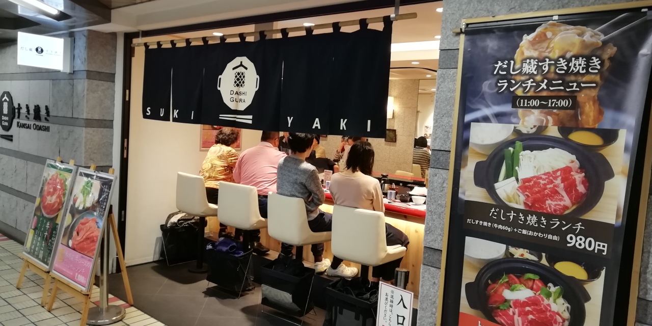 西国三十三札所巡り3泊4日旅の初日の昼食で利用しました。第23番札所勝尾寺の最寄り駅である千里中央駅で勝尾寺までのバスの待ち時間30分程の間に食べられるファーストフードを探しました。駅前のバス停近くには店がなかったのでファーストフードはあきらめ地下鉄の改札階(地下1階)にやや古びた感じの飲食店街の中で外見が一際新しくきれいな店にしました。関西おだしを割り下に使ったすき焼きの店です。看板にあっただしすき焼きランチ(税込980円)にしました。自販機で食券を買いカウンター席に座ります。すき焼きは卵にしますか山芋にしますかと聞かれ一瞬迷いましたがごく普通に卵にしました。程なく目の前のIHの上に具一式が入った鉄鍋が置かれましたが一番上に綿菓子が載っています。普通の砂糖に比べ肉全体にまろやかな甘味がしみこむそうです。言われてみればそうかなとも思いますが徐々に綿菓子が溶けていく様は見ていて楽しくすき焼きも美味しく戴きました。ご飯はおかわり自由です。店は常に満席状態で繁盛している感じでした。限られた時間での昼食にお勧めです。