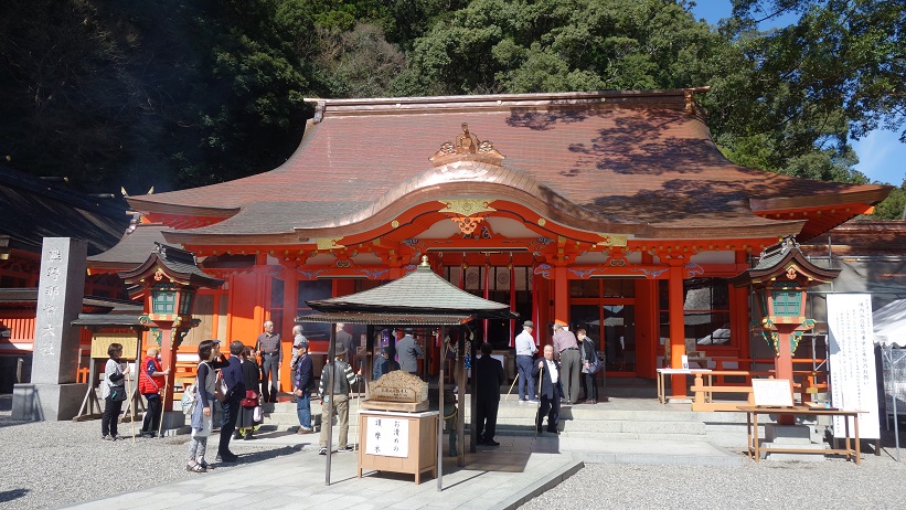 那智の大滝が那智大社のご神体です。大門坂を登るとその先に滝が見えてきます。落差百三十三メートルは日本一番、日光華厳滝を凌駕する規模と荘厳な様子は、奈良や京の都の五重塔や七重の塔を上回る威圧感があり神々しさがあります。本地垂迹説によれば、那智大社の主神は熊野夫須美大神、本地は千手観音です。真横が青岸渡寺というスタイルは、神仏習合という日本の信仰のスタイルを現しています。