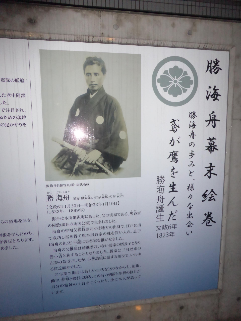 本所松坂町公園(吉良邸跡)から数分歩いたところの両国公園の片隅に勝海舟生誕の地の碑とその由来の碑文があります。