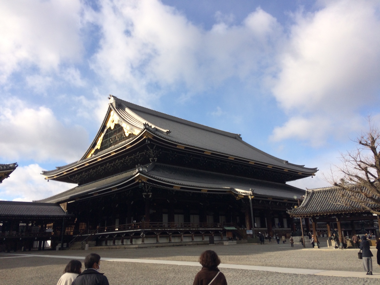 御影堂門から入って正面に見える大きな建物です。1895年に再建された建築面積において世界最大の木造建造物で、外観もそうだけど中に入るとより大きさを実感できます。この再建のために必要とされた巨木を運ぶ大橇(おおぞり)や人間の毛を織り込んだ毛綱などが高廊下に展示されており、重機がなかった時代の信徒や職人のご苦労が忍ばれます。