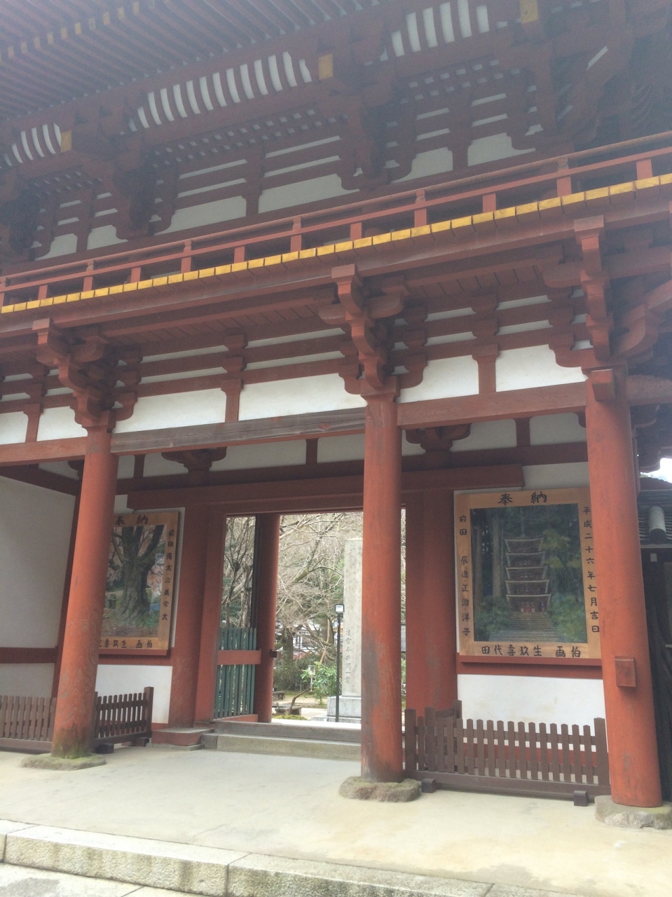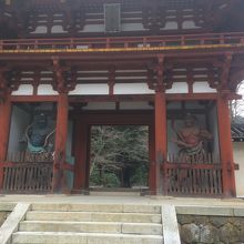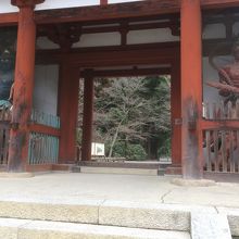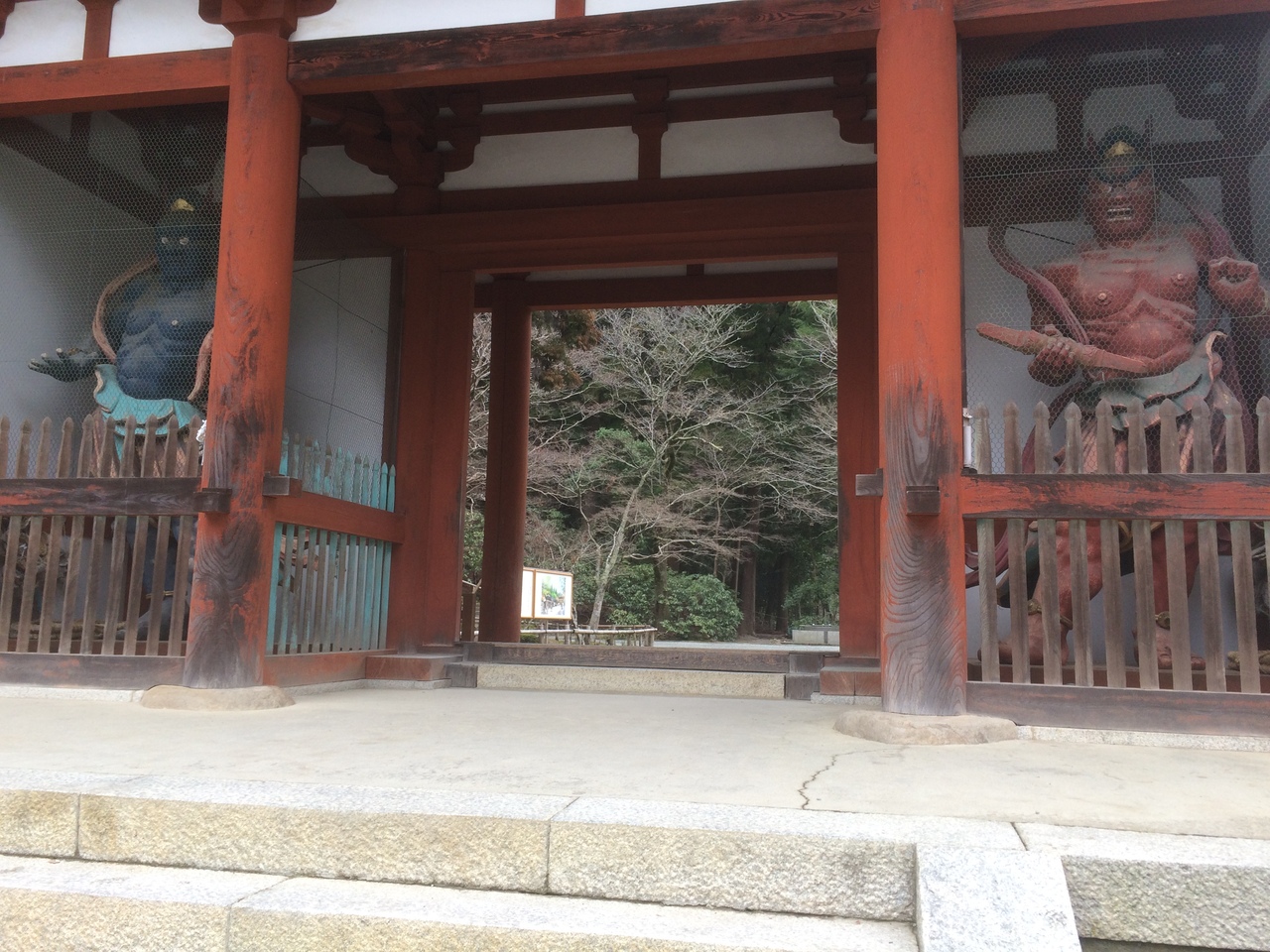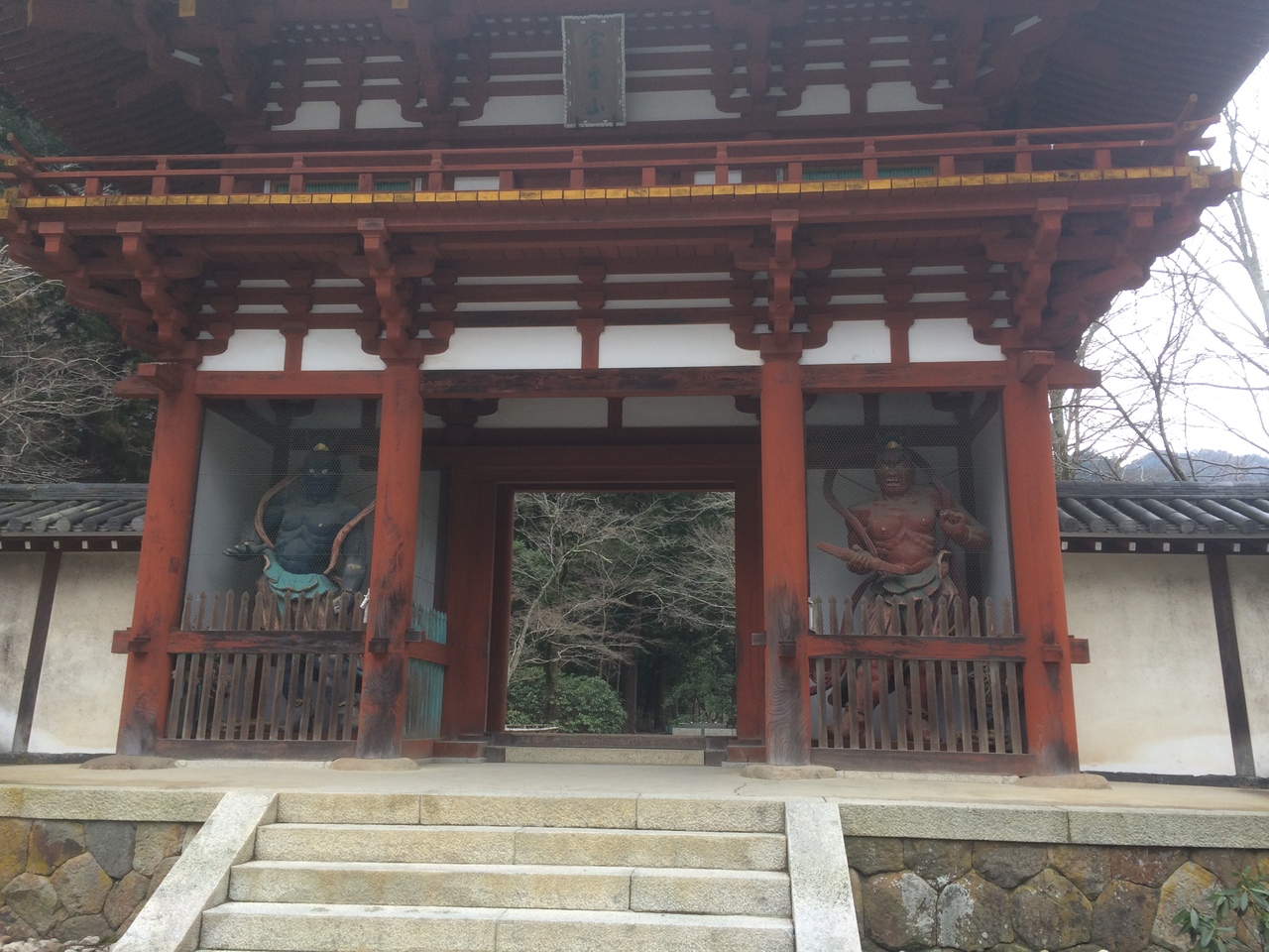 門の左右には、左に青い仁王像、右に赤い仁王像が睨みつけていました。門の左右は白い壁になっていて潜って裏側の左右を見ると、室生寺の絵が描かれていました。どっしりとした正方形ぽい形の門で、大きく迫力があるので、室生寺が大きな寺だと実感しました。