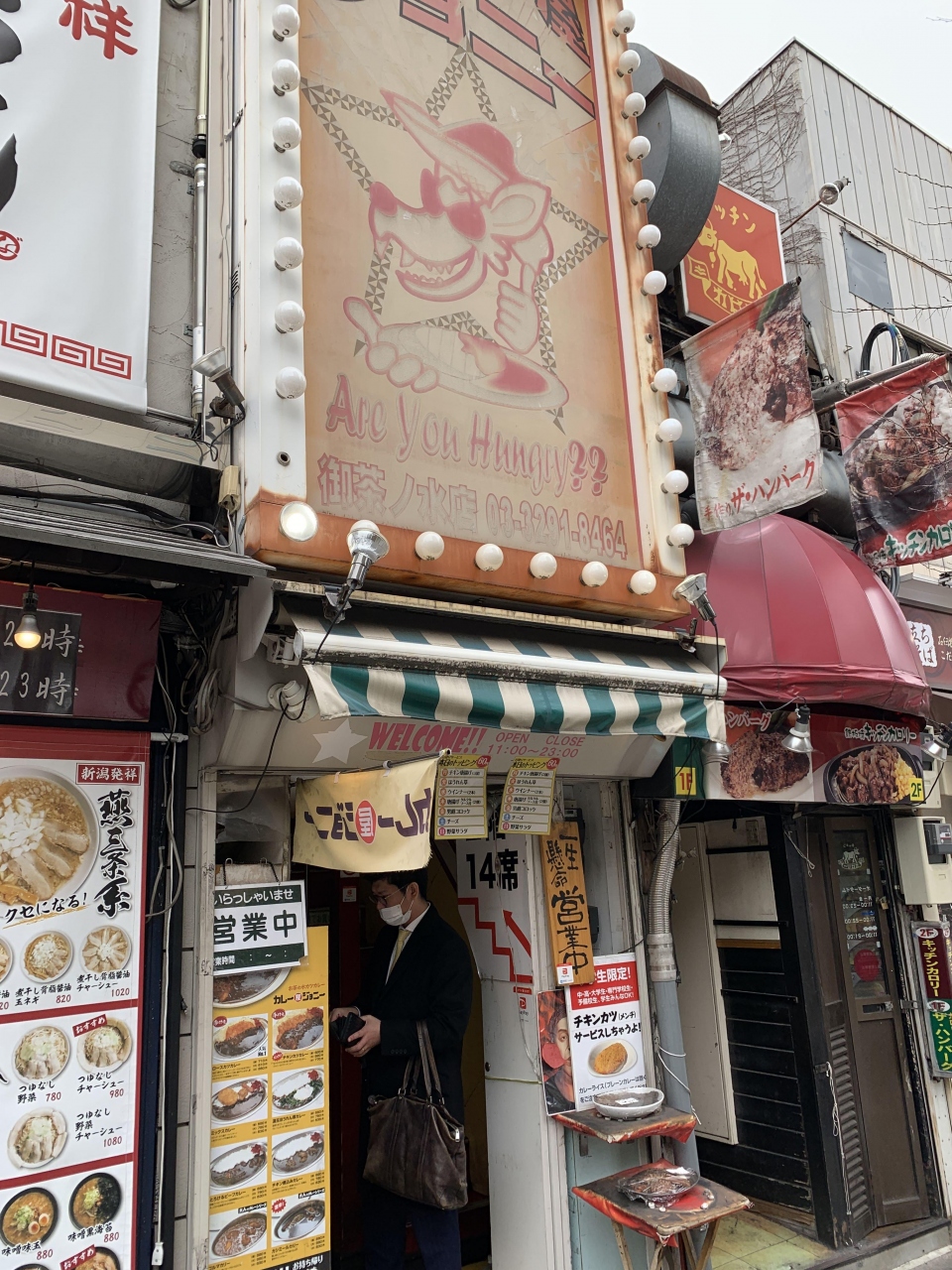 JR中央線・総武線御茶ノ水駅の聖橋改札でてすぐ、東京メトロ千代田線新御茶ノ水駅地上に上がったところにあります。お店の前の歩道がせまくて上を見上げながら歩くと人とぶつかりがちです。この店は歴史を感じずにはいられませんが辛さも印象的です