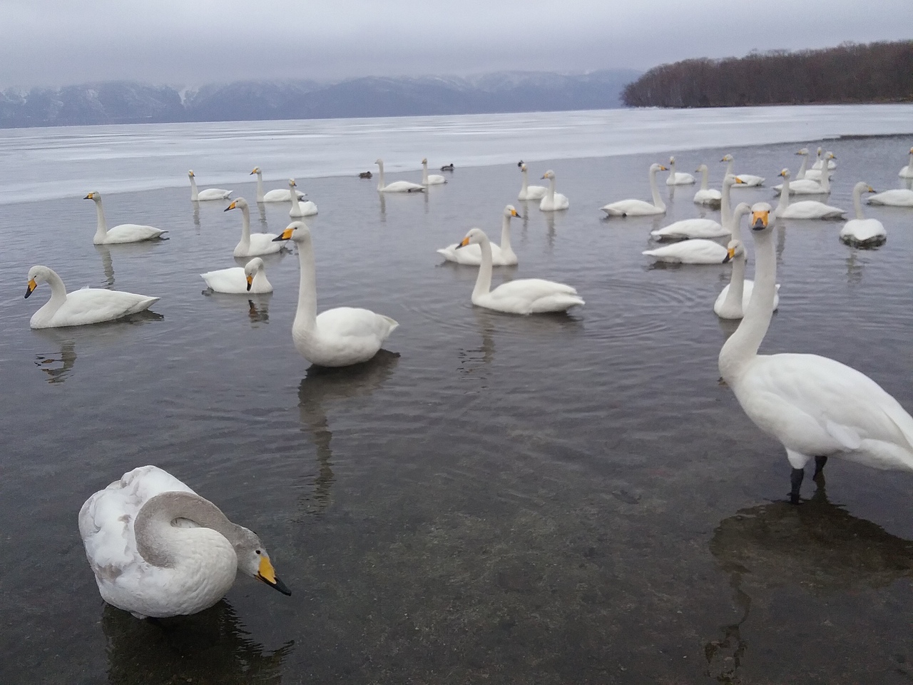 屈斜路湖畔にある「砂場」という掘ると温泉が出てくる場所です。温泉で温かいのでその周辺だけ水が凍っておらず、白鳥の群れがたくさんいました。