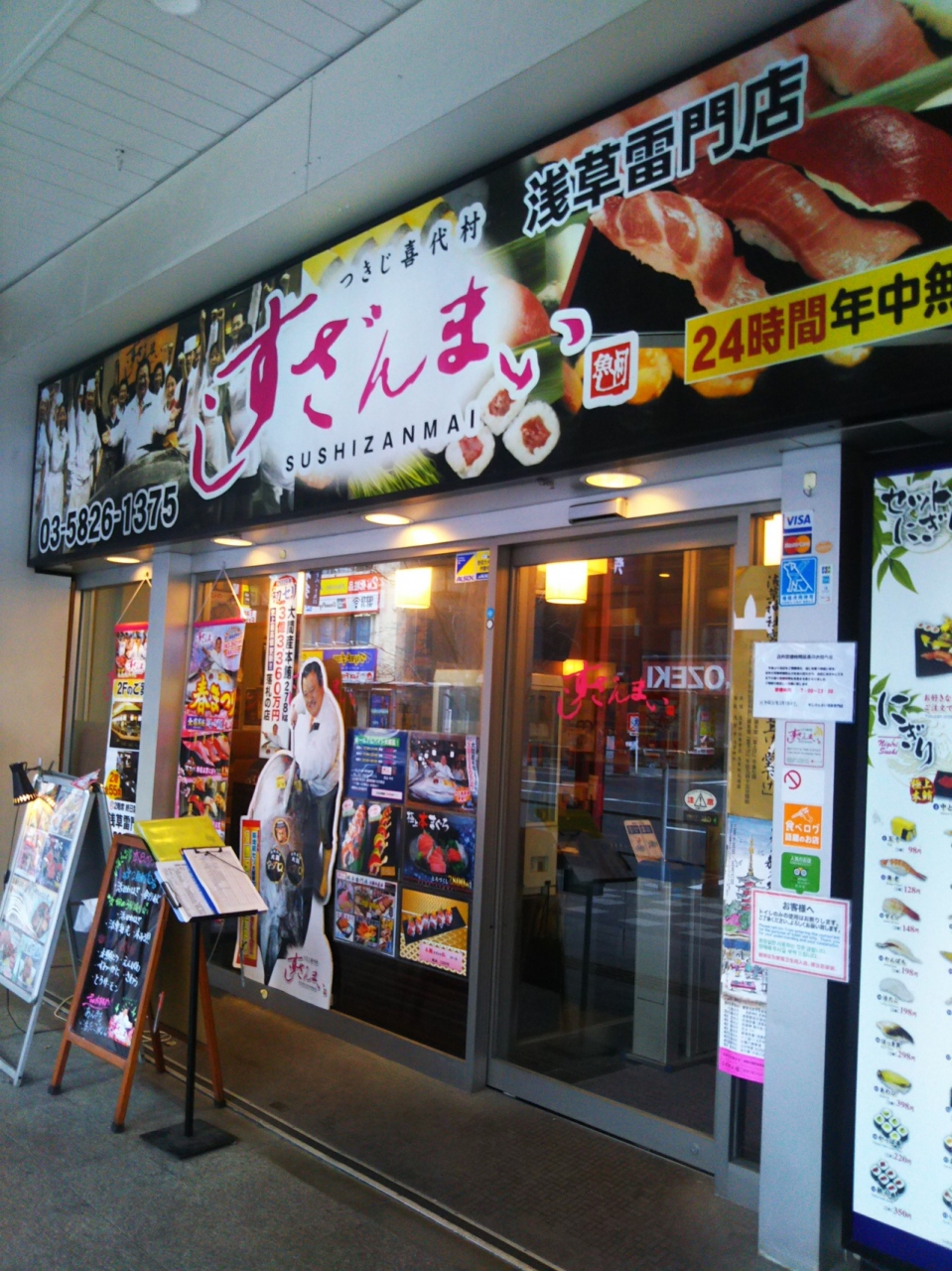 東京都台東区にある人気観光スポット、浅草にあるレストランです。お寿司の専門店です。24時間営業もしています。春まつりでマグロの5貫セットの大とろは口に入れた瞬間的にとろけました。お酒のつまみになるような料理もあり、のんびり過ごせました