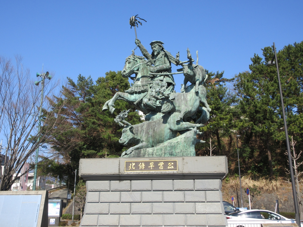 小田原駅西口に建つ、高さ5.7mの大きな像です。牛の角に松明を結び、大軍の夜襲に見せかけたといわれる戦術を再現しています。甲府駅前に建つ武田信玄像同様、小田原を支配しようとした人物にふさわしい堂々とした像だと思いました。駅前から小田原の発展を見守っているように感じました。観光施設が多くある東口と反対側に建っているため、訪れる人が少ないのが残念です。