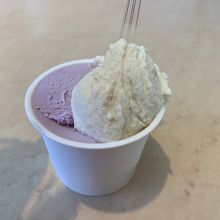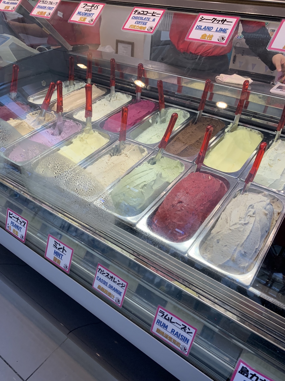 東京に帰る飛行機に乗る前に、お店に行きました。フードコートっぽくなっています。座席もわりとたくさんありました。カップに二種類のフレーバーを盛るダブルにしました。南国らしいフレーバーがあります。ハンバーガーもありました。甘すぎる味ではなく、さっぱりしたジェラートでした!