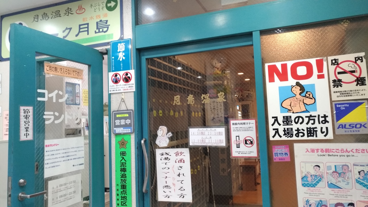 ものすごいかっこいい、月島温泉という看板がすごくて印象に残りますね。中は普通の温泉で露天風呂的なものもあります。マッサージ効果があるものもありますし、電気風呂もあります。オムツが、とれていればお子さんも問題ないようです。