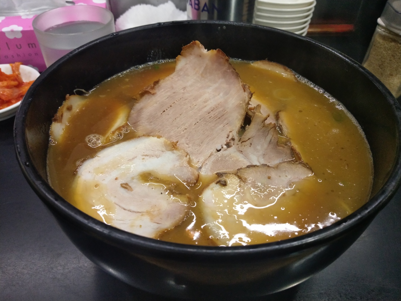 おなかが空いたので寄りました。カウンター席だけで、駐車場もないです。お昼時なので混雑しておりましたが、何とか座って注文。半チャーシュー麺850円。半といってもラーメン一杯にチャーシューがのっています。チャーシューは歯ごたえもあって軟らかくて美味しいですね。ラーメンのスープはやはり最高です。