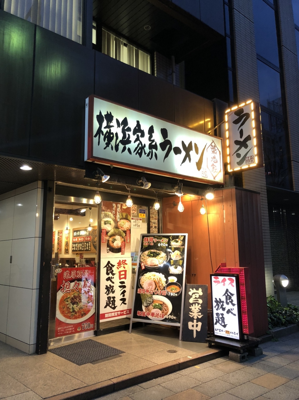 横浜家系ラーメン店です。このジャンルは似たようなお店が多々ありますが、基本的には同じような雰囲気でした。注文したのは、豚骨ラーメン。とんこつで有名な博多ラーメンのようなクリーミースープではなく、濃厚感の強いがっつり系で、テイストは全く違います。麺も太め。どちらかといえば食べ応えありといった感じでしょうか。味自体はけっこう好きです。場所は晴海通りを挟んだ築地場外の向かいあたり。訪れた週末の夕方はけっこう空いてました。