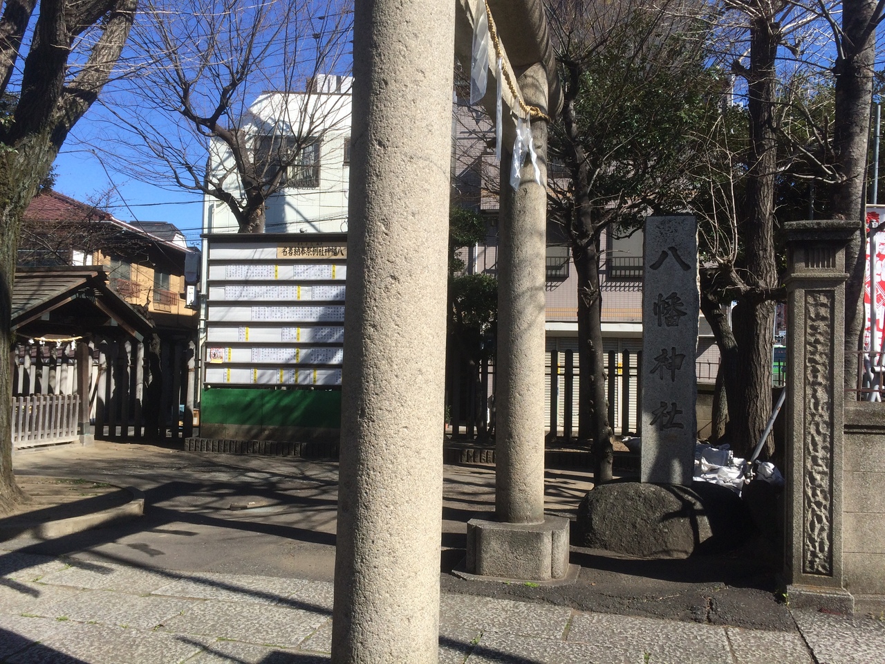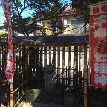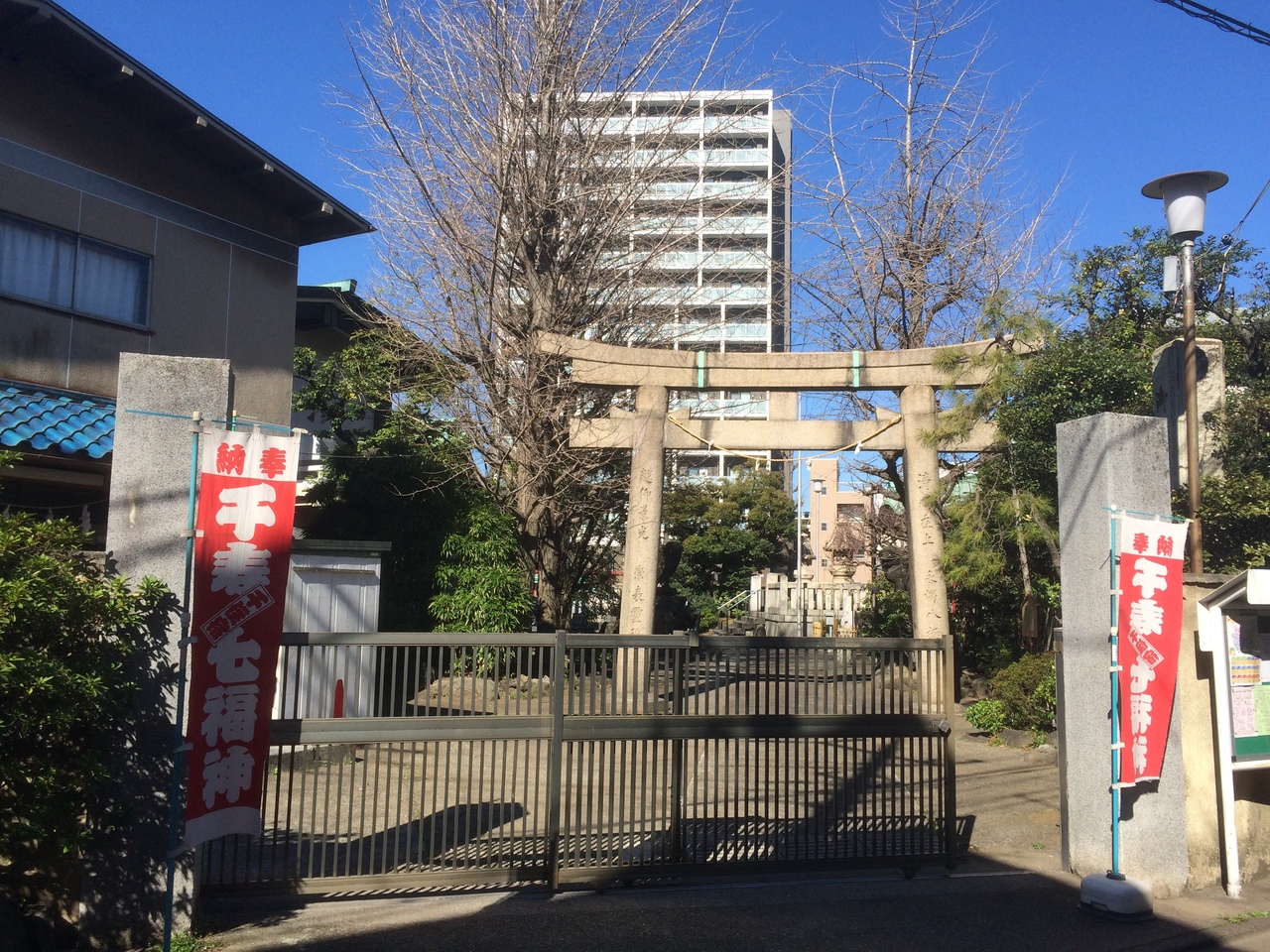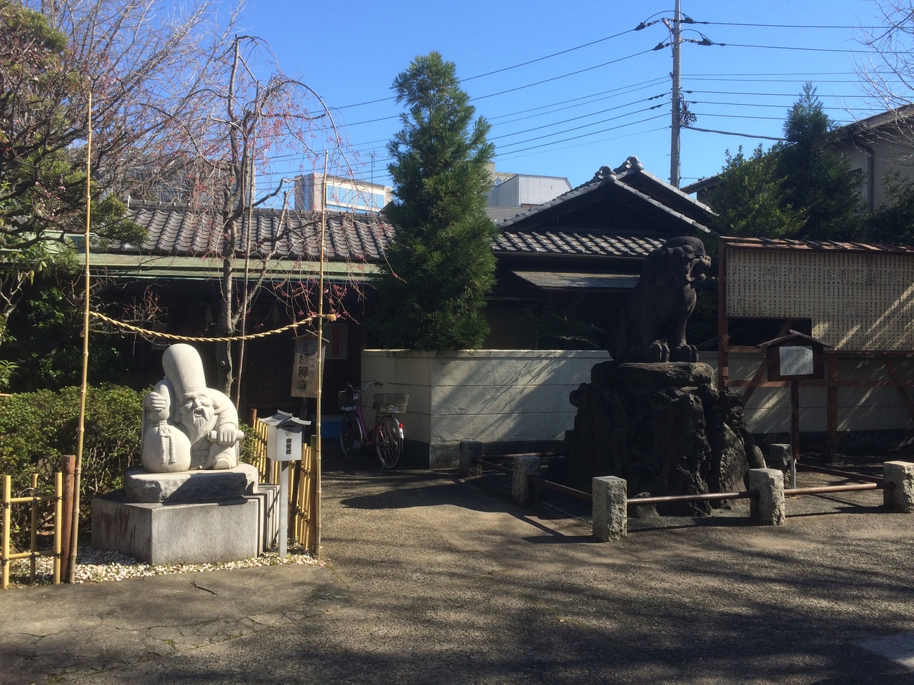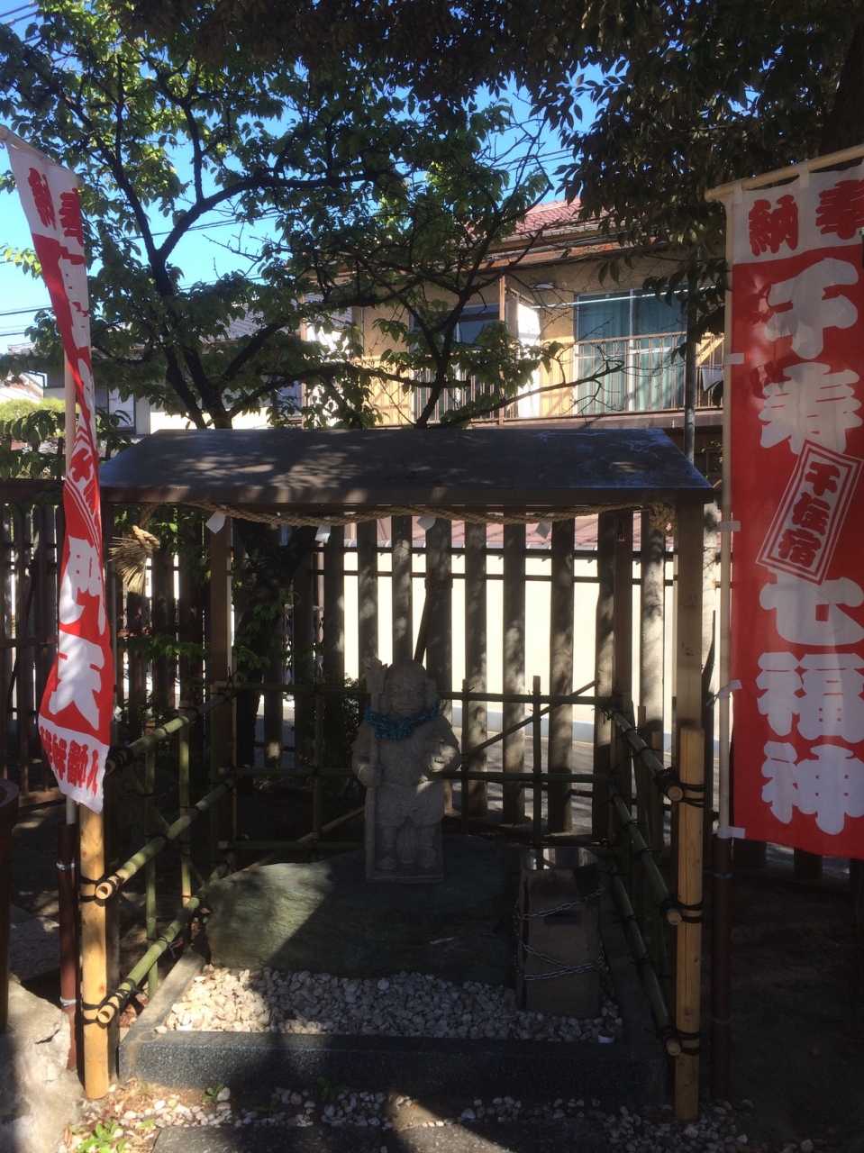 ぷらぷら歩いていると赤い幟があったので行ってみました。稲荷神社の境内にあり、穏やかな白い七福神でした。八幡神社の七福神は、お堂のようなものに入り、右手に金棒のようなものを持ち、睨みつけていました。赤い幟が鮮やかなので目立つ幟でした。
