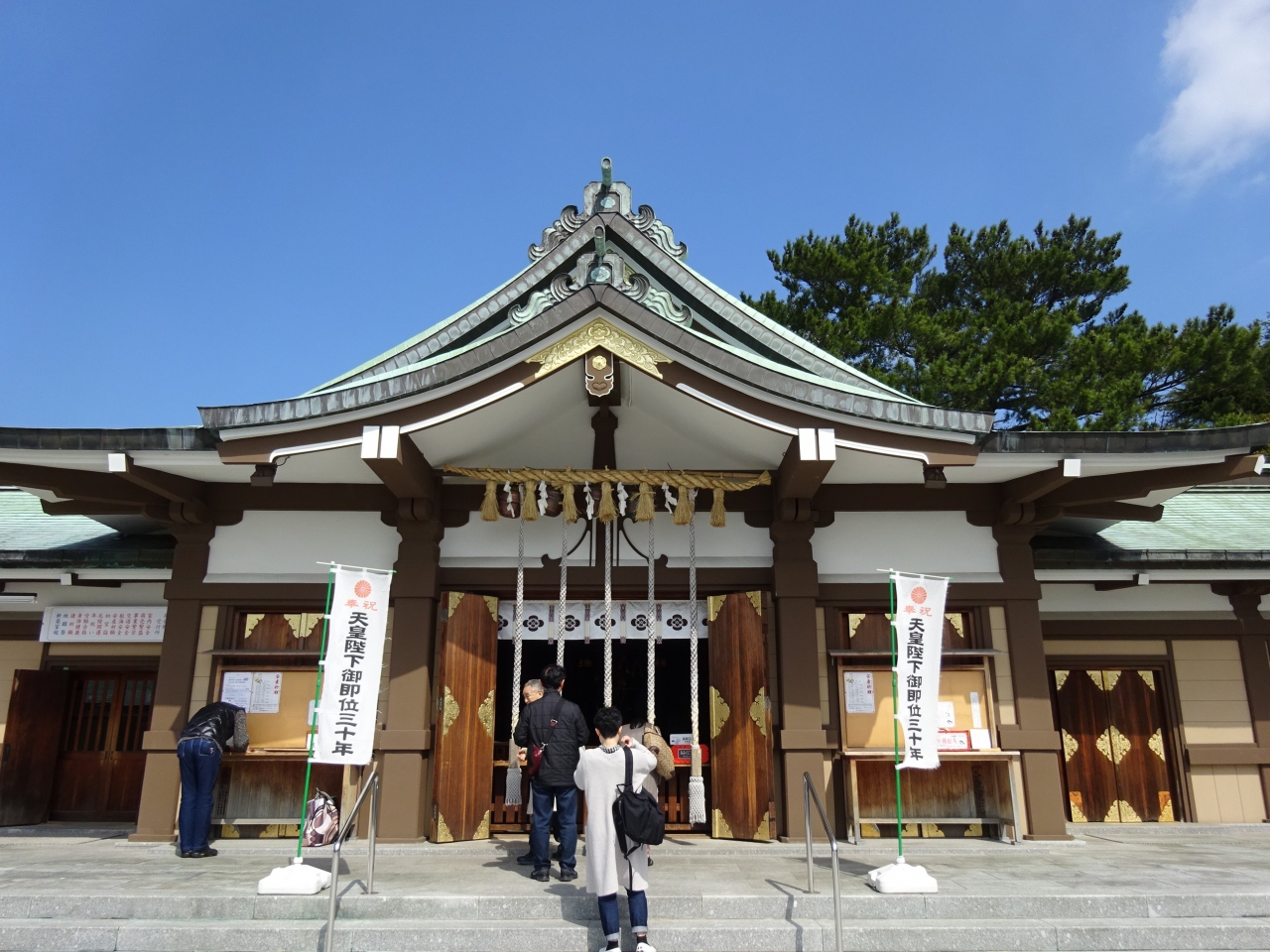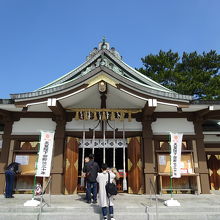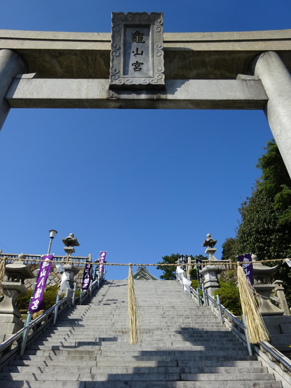 赤間神宮の近く、唐戸市場から道路を挟んですぐの高台にあり、境内からは関門海峡を眺めることができます。