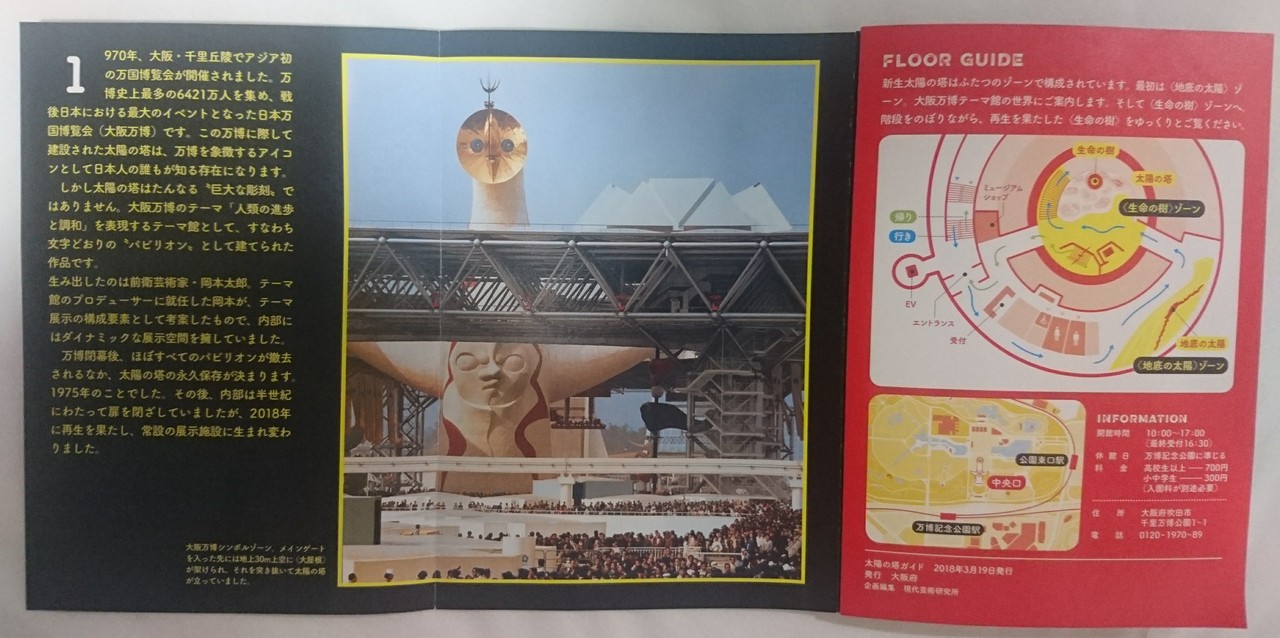 日時指定完全予約制。予約時間の20分前から入場可。入口は太陽の塔の右手下(向かって左手側)。エントランスは太陽の塔の初期のスケッチとプロジェクションマッピング。その後、最大16名ずつ内部へ。写真撮影は1階からのみ可。階段で1フロアずつ案内の係りの方と共にあがっていく。年配の方や親子連れはエレベーターあり。