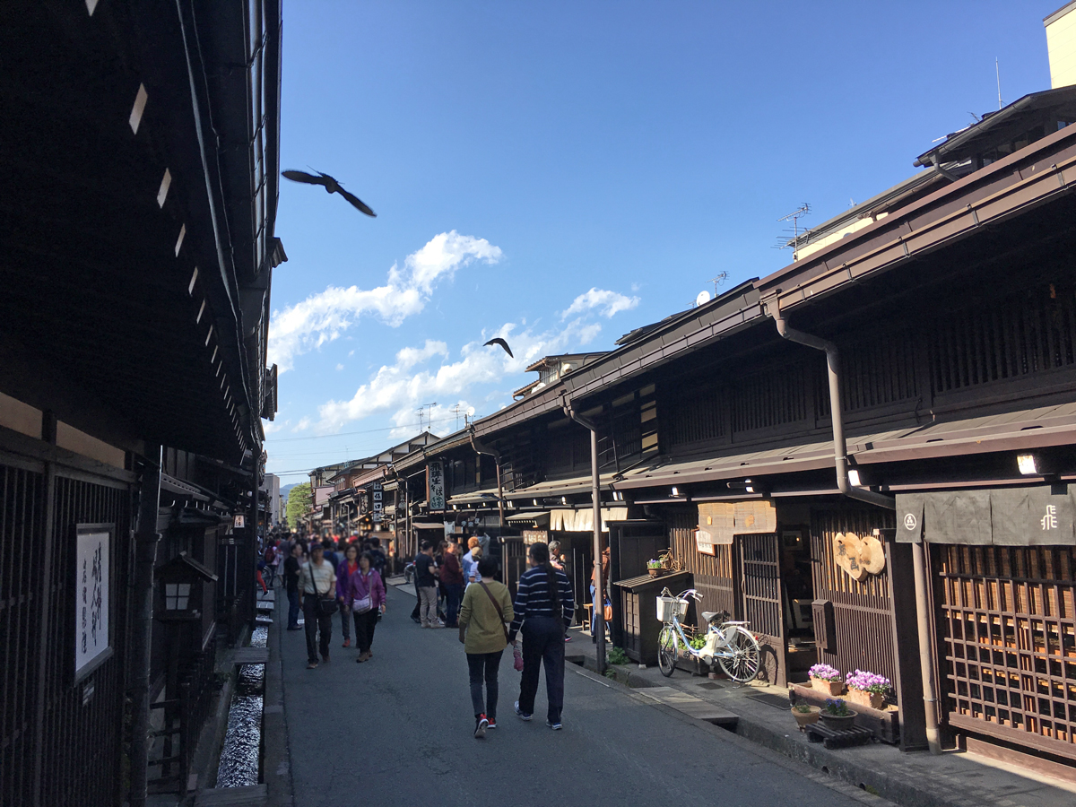 飛騨高山市街地の観光で外せないのがこの古い町並み。この周辺ではコンビニの看板も景観に配慮した仕様になっています。