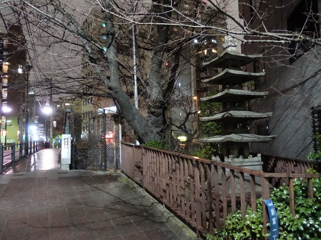 京橋公園のすぐ南を東西にのびる通りが、首都高速道路と交差する部分に架かるのが「新富橋」です。夜は人も車も通行が少なくひっそりとしています。橋のたもとには石塔があるのですが、これが橋と関係しているか否かは不明です。明かりも少なく、銀座の喧騒とは全く異なる世界でした。