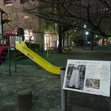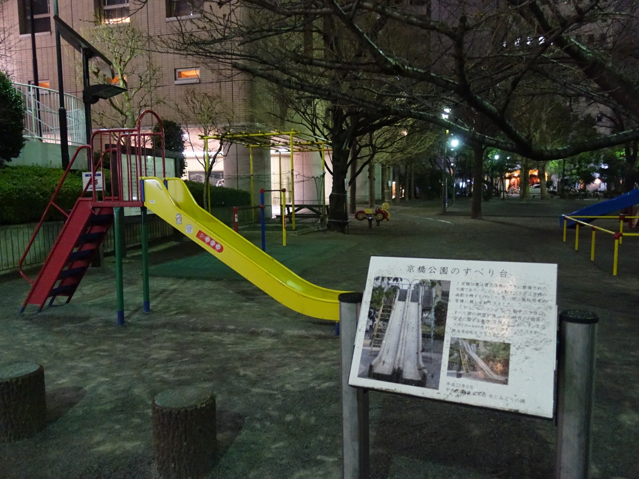 2月の夜の京橋公園は、何の飾りつけもなく静まり返っていました。それゆえに目についたのが、すべり台と、「京橋公園のすべり台」という案内板です。それから類推するに、こちらの公園は「震災復興52小公園」の指定を受けた公園のようで、都心の一等地に変わらぬ姿で残されているのには、深い理由があるようです。