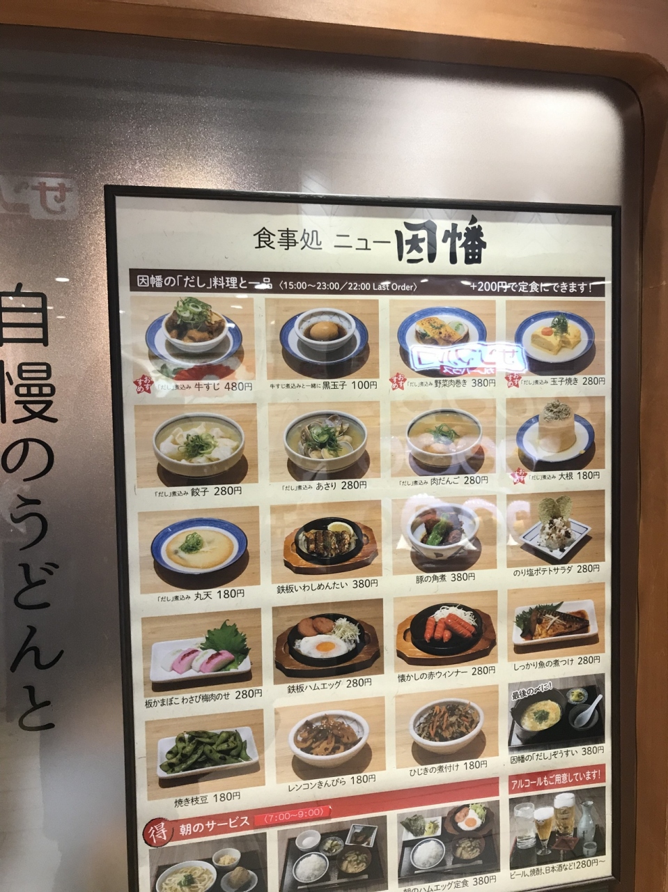 博多にあるうどんの因幡さんです。うどんと一緒に、角煮や福岡名物の明太子が詰まった明太いわしなどの料理が400円前後とリーズナブルにお値段でいただけちゃいます。角煮はかなり柔らかく煮込まれていて、美味しいです。