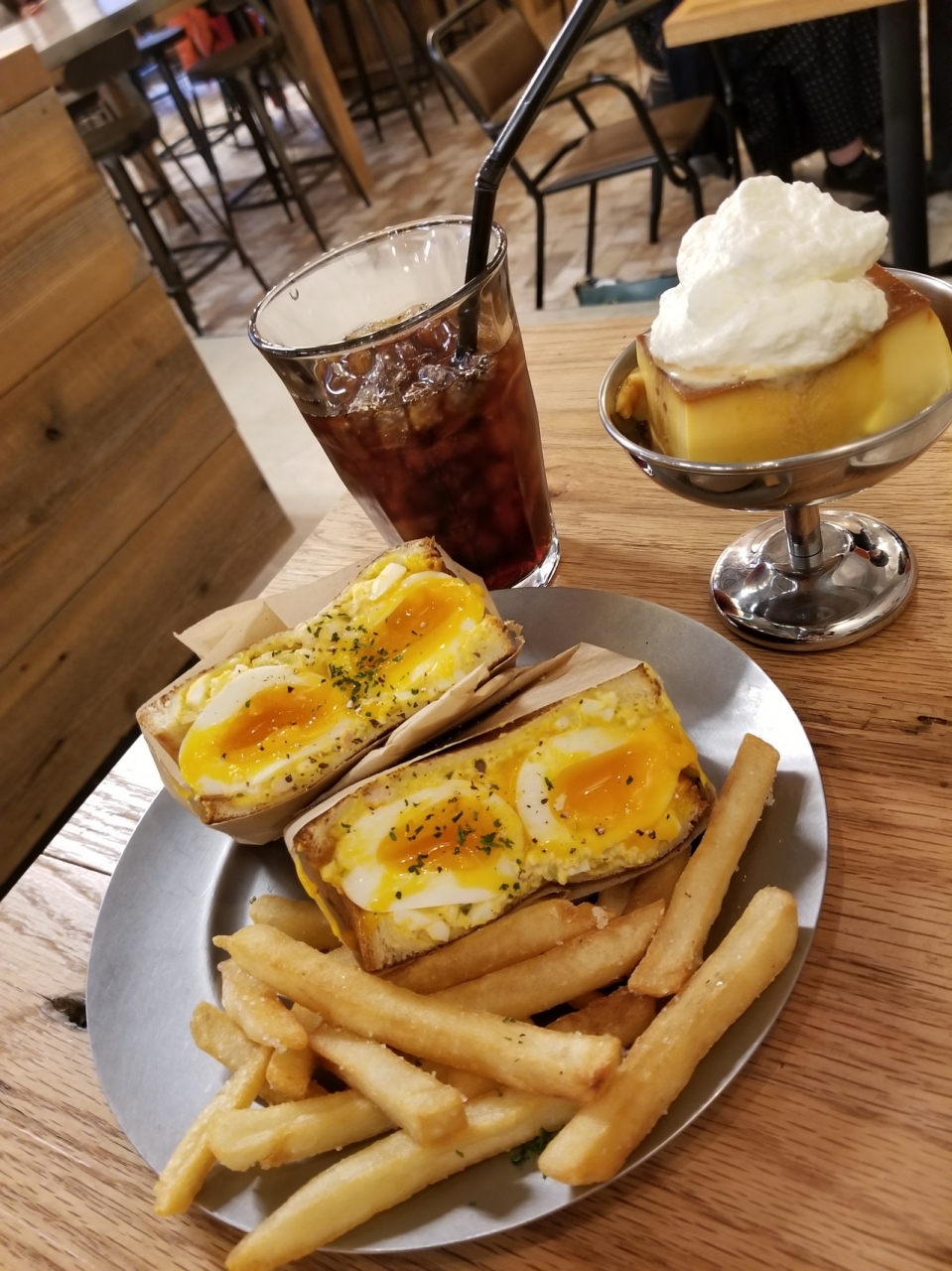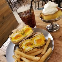 たまごとパン、プリンが美味しいカフェです。 店内は2階建てになっていておしゃれな照明があり、オープンキッチンで、フレンチトーストや、エッグサンドなどの軽食系とスイーツ系が楽しめます。プリンは、昔懐かしいカラメルのきいた、美味しい味でした。上に乗っているホイップも美味しいです。コーヒーも焙煎されていて、美味しかったです