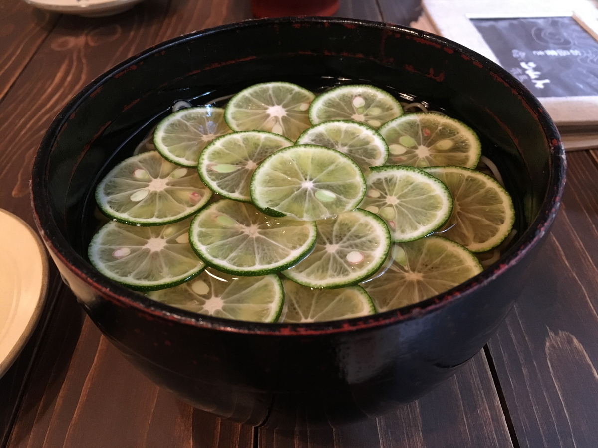どんぶりいっぱいにすだちが並べられた、すだちそばを食べることができるお店です。すだちの風味と、お出汁の香りがほどよく麺に絡み、非常においしい一品です。すだちそばの他にも定番のおそばなどのメニューがありました。