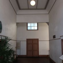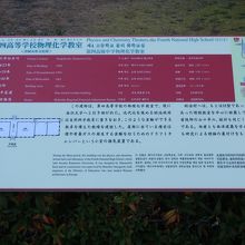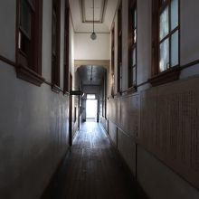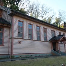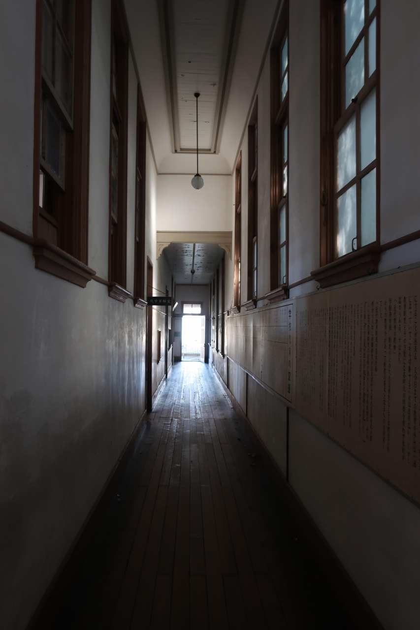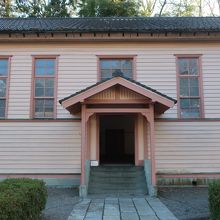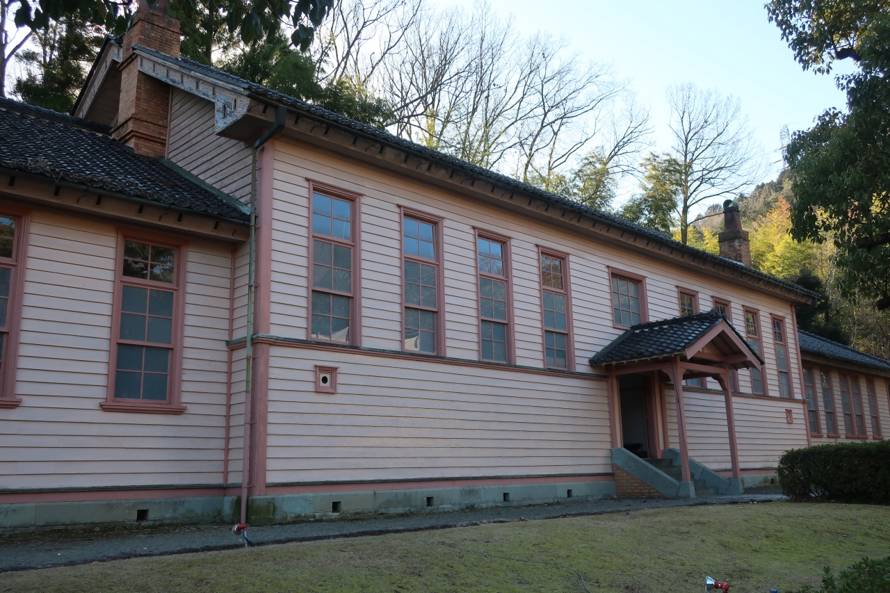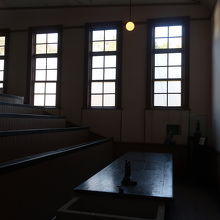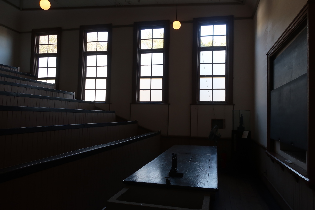 明治村2丁目の東山梨群役所からレンガ通りを見て右手に第四高等学校物理化学教室があります。明治23年に金沢の高等学校(のちの金沢大学)の物理化学教室として建てられたものです。木造の建物は至ってシンプル。黒板のある階段教室は今の学校とほとんど変わりません。無声堂とならび官立旧制高等学校が如何に立派であったかが分かる教室です。