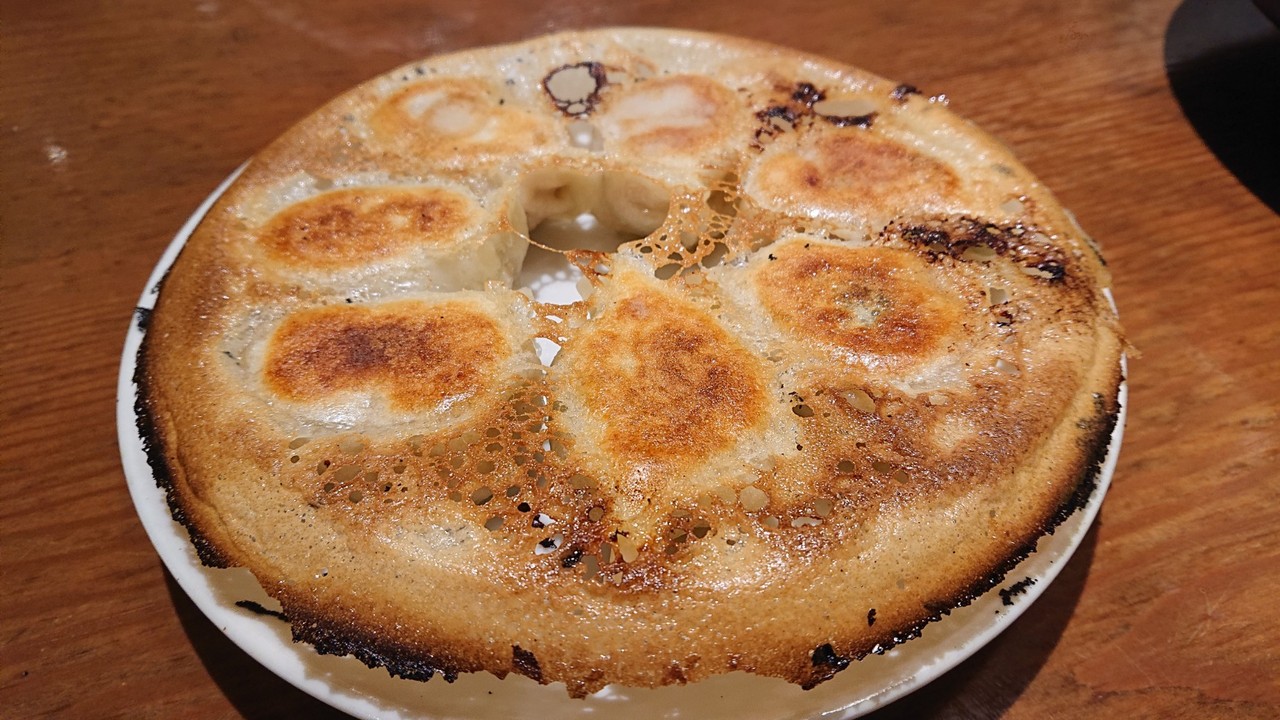 餃子がパリパリの豪快な羽根に迫力あり、中は小籠包のように肉汁が溢れて具がジューシー。