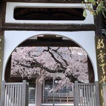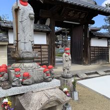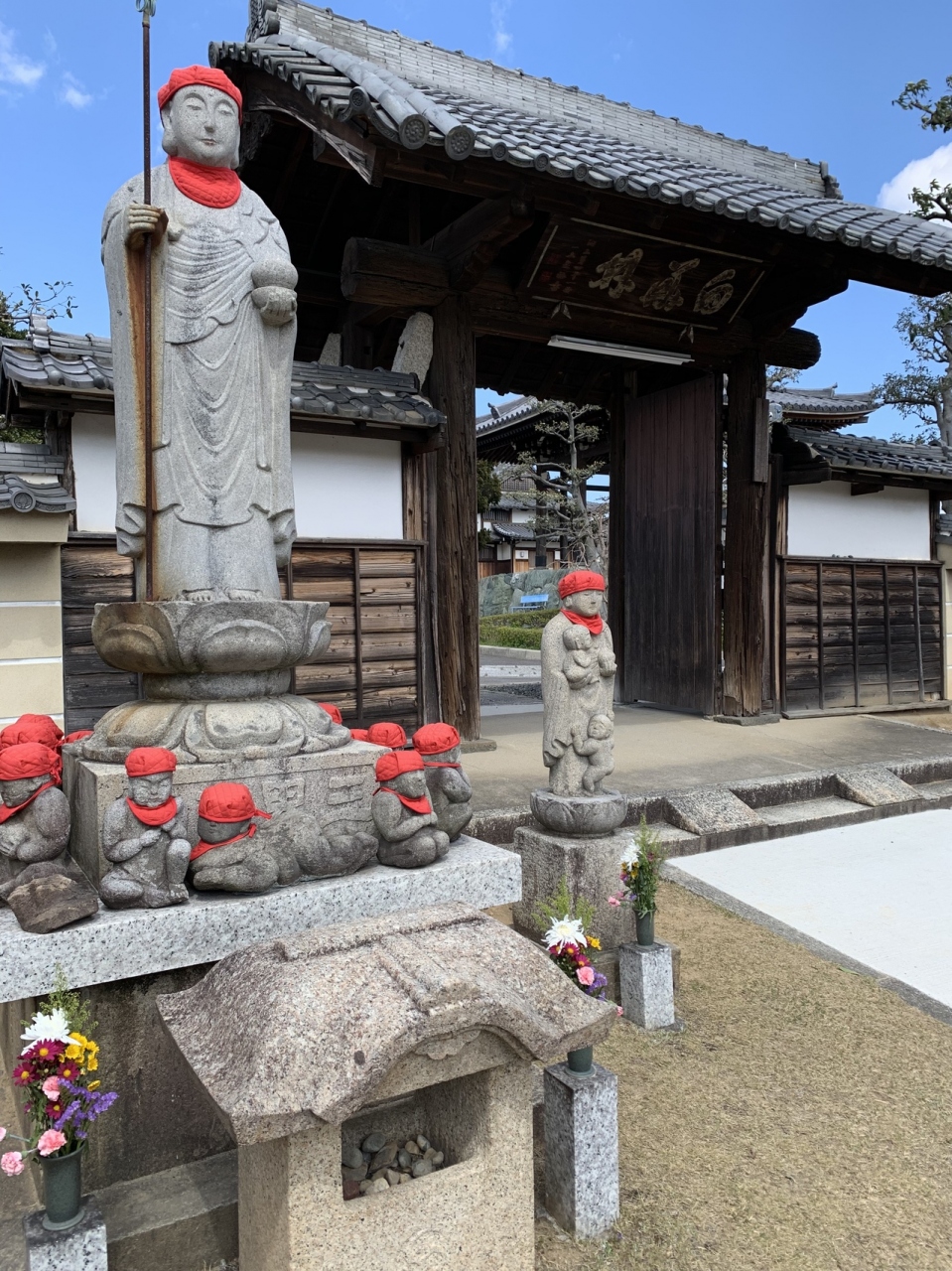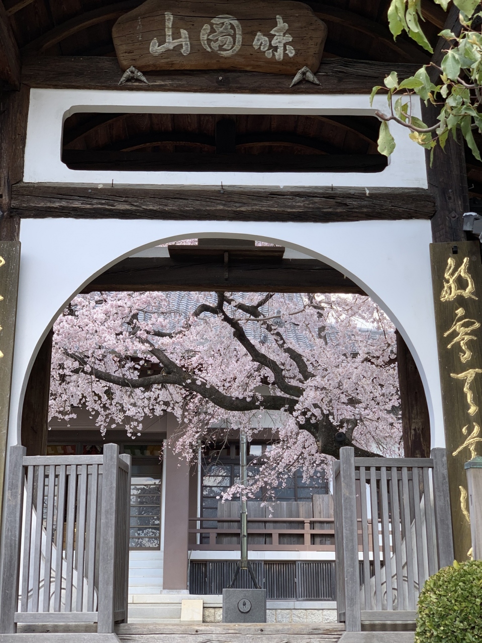 名古屋市の住宅街にある静かで立派なお寺です。駐車場が広くて停めやすいのも良かった。入口のお地蔵さんは印象的で目立つ。境内入口の可愛い丸い門が額縁になり、満開のしだれ桜が切り取られた絵のように一層華やかで綺麗に見えますよ。