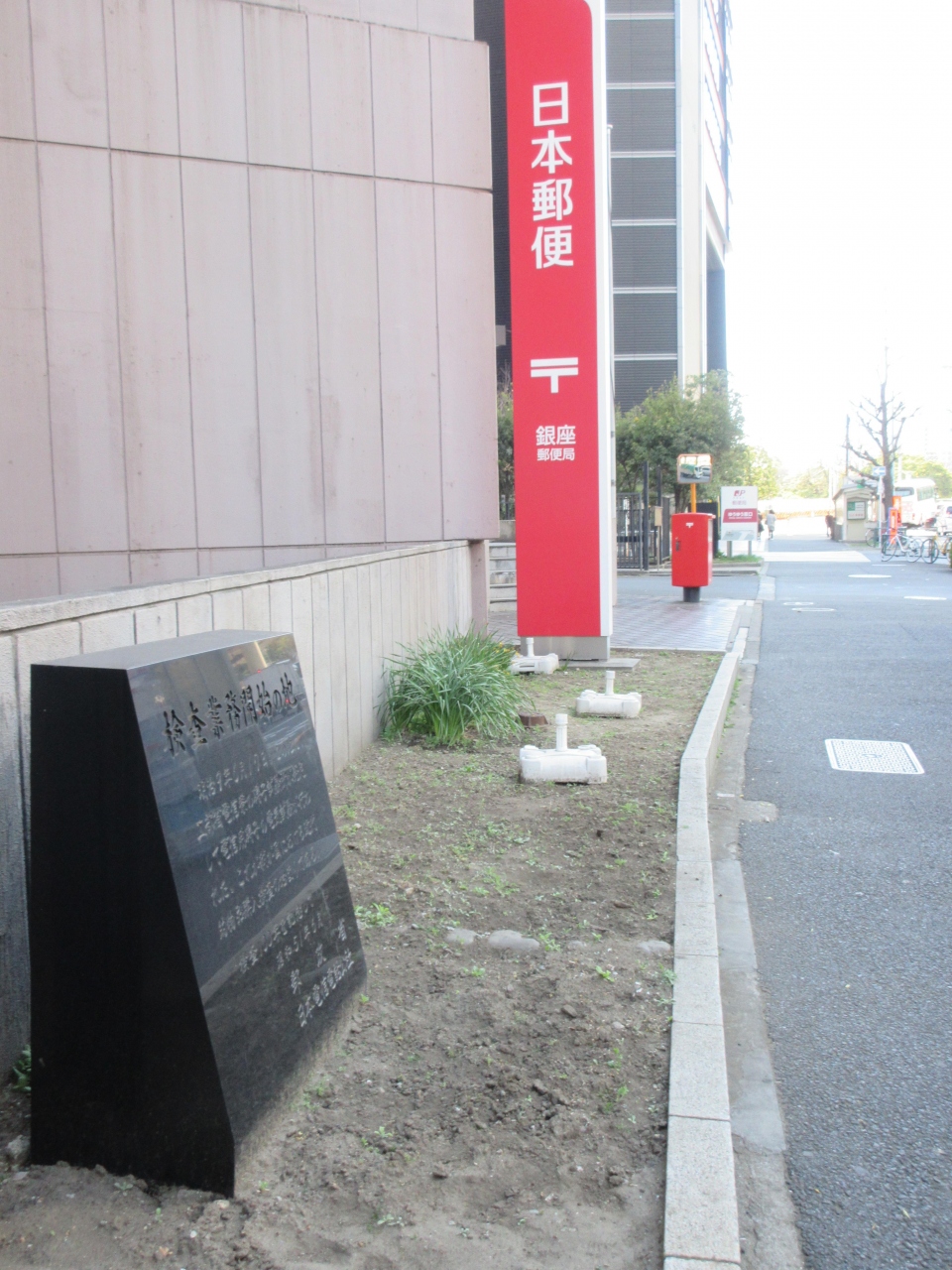 銀座8丁目、首都高速の下に建つ銀座郵便局の植え込みの中に碑が建っています。碑には近代的物品購入検査として、電信用碍子の電気試験が行われてから100年を記念してと刻まれています。碍子とは電線を絶縁する器具だそうですが、碑の内容だけでは具体的な内容がよくわかりませんでした。実験が成功したことは喜ばしいことでしたが、せっかく造った碑なのですから、多くの人に理解してもらえる文言にしてほしかった気がしました。せめて補足の説明文が書かれた説明板があると嬉しかったです。