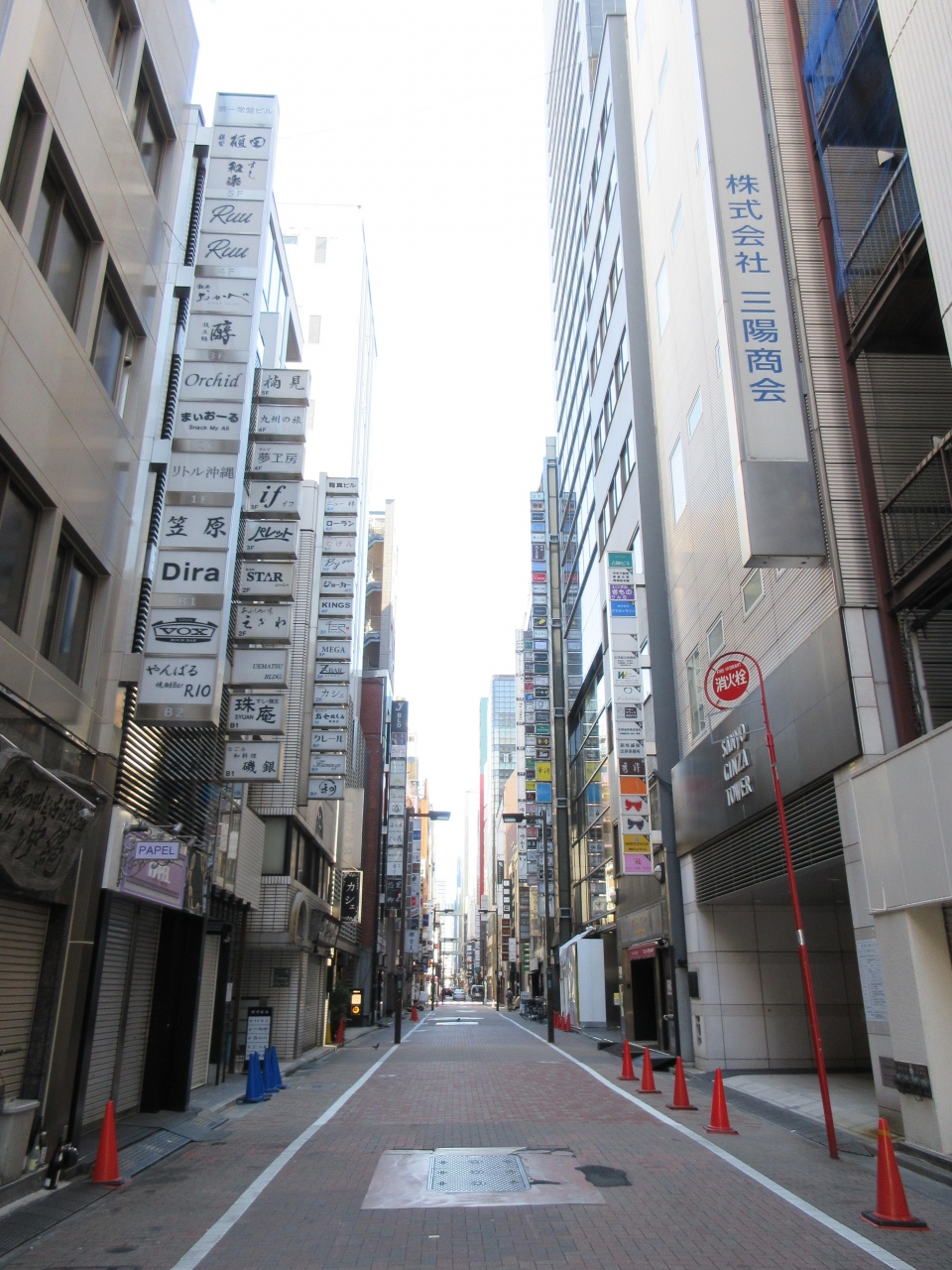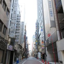 中央通りの1本西側、御門通りから入る150mほどの通りです。かつては能楽の金春流の屋敷があったり、花街があったりした通りだったようですが、現在、通りの両側にはバーや飲み屋が何軒も入っている雑居ビルが建ち並んで、昼と夜の姿が全く異なるエリアになっています。通り沿いには明治時代に煉瓦街だった銀座の遺構や、江戸時代の水道管として使用されていた木管が残っていたり、江戸時代末期から営業を続ける銭湯があったり、銀座の歴史を感じることができる通りでもあります。