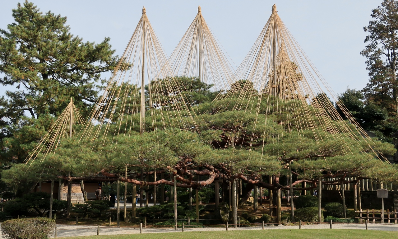 ヤマトタケルの像が立つ明治記念之標のそばにある松だ。京都の西本願寺と東本願寺の門跡から「手向けられた」ので、手向松とも呼ばれる。明治記念之標は西南の役で戦死した郷土軍人の霊を祭っており、この松も慰霊のために贈られた。素晴らしい樹勢だが、兼六園の数多い樹木の中でも前田家との関わりがないものだ。
