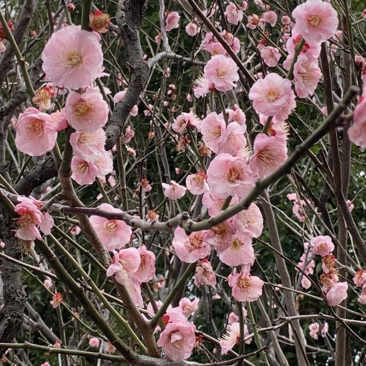満開の時は過ぎ、遅咲きの梅が6分咲き