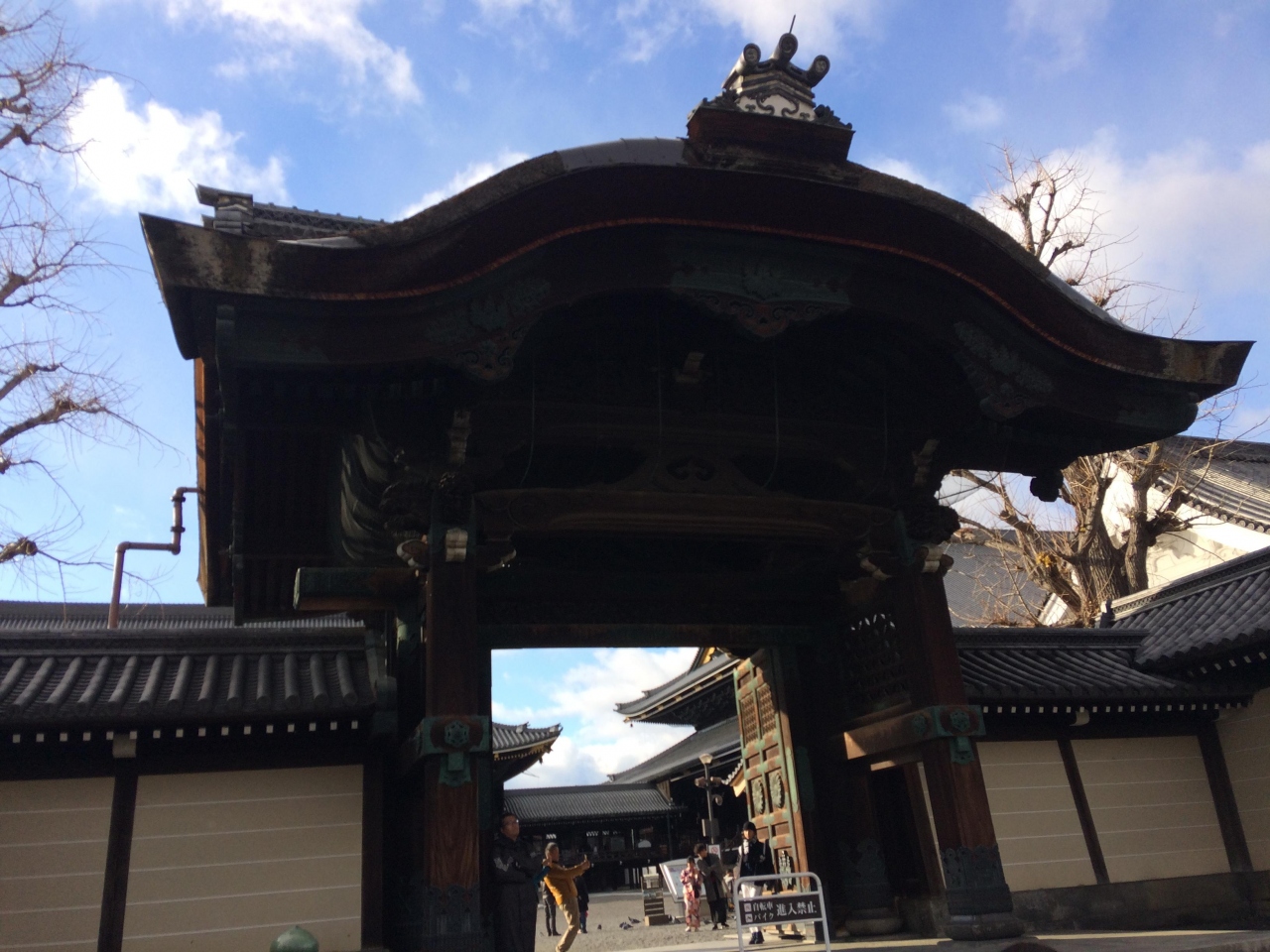 東本願寺には烏丸通りに面した2つの門がありますが、京都駅寄りの小さい方の門が阿弥陀堂門です。小さい方と記述しましたが、御影堂門が京都を代表するようなあまりにも大きな門のためそう感じるだけで、桧皮葺の屋根の絵になる立派な門です。この門を潜って中に入ると、正面に見えるのが阿弥陀堂になります。