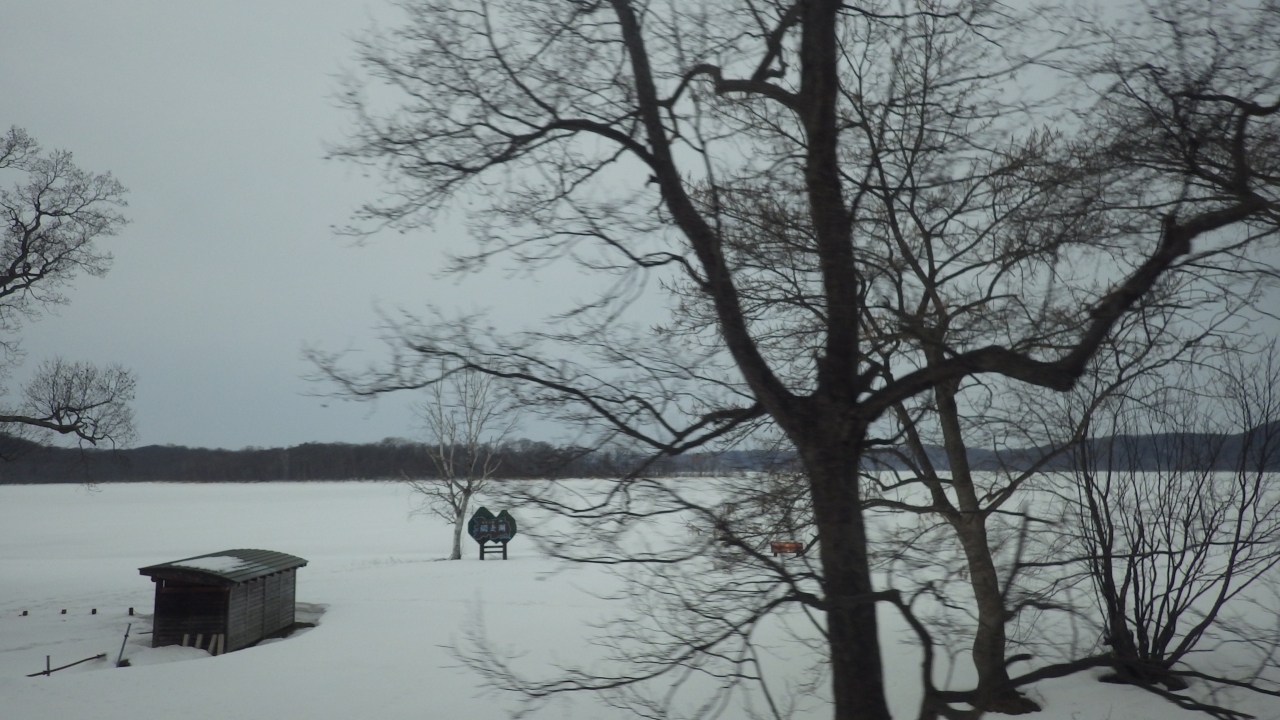 凍結しているので真っ白です。このような大きな湖がほぼ全面凍結しているので、寒さの厳しさがうかがい知れます。