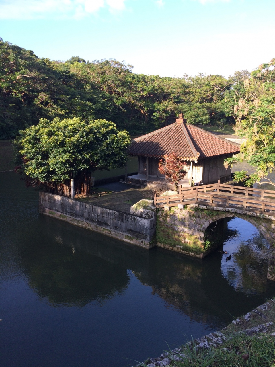 建物の手前に、15世紀につくられたという説明書きがありました。ゆいレールの首里城駅から首里城に向かって歩いていると、右手に見えます。池に囲まれた屋敷があり、自由に入ることができます。竜宮城に近い雰囲気の建物でした。