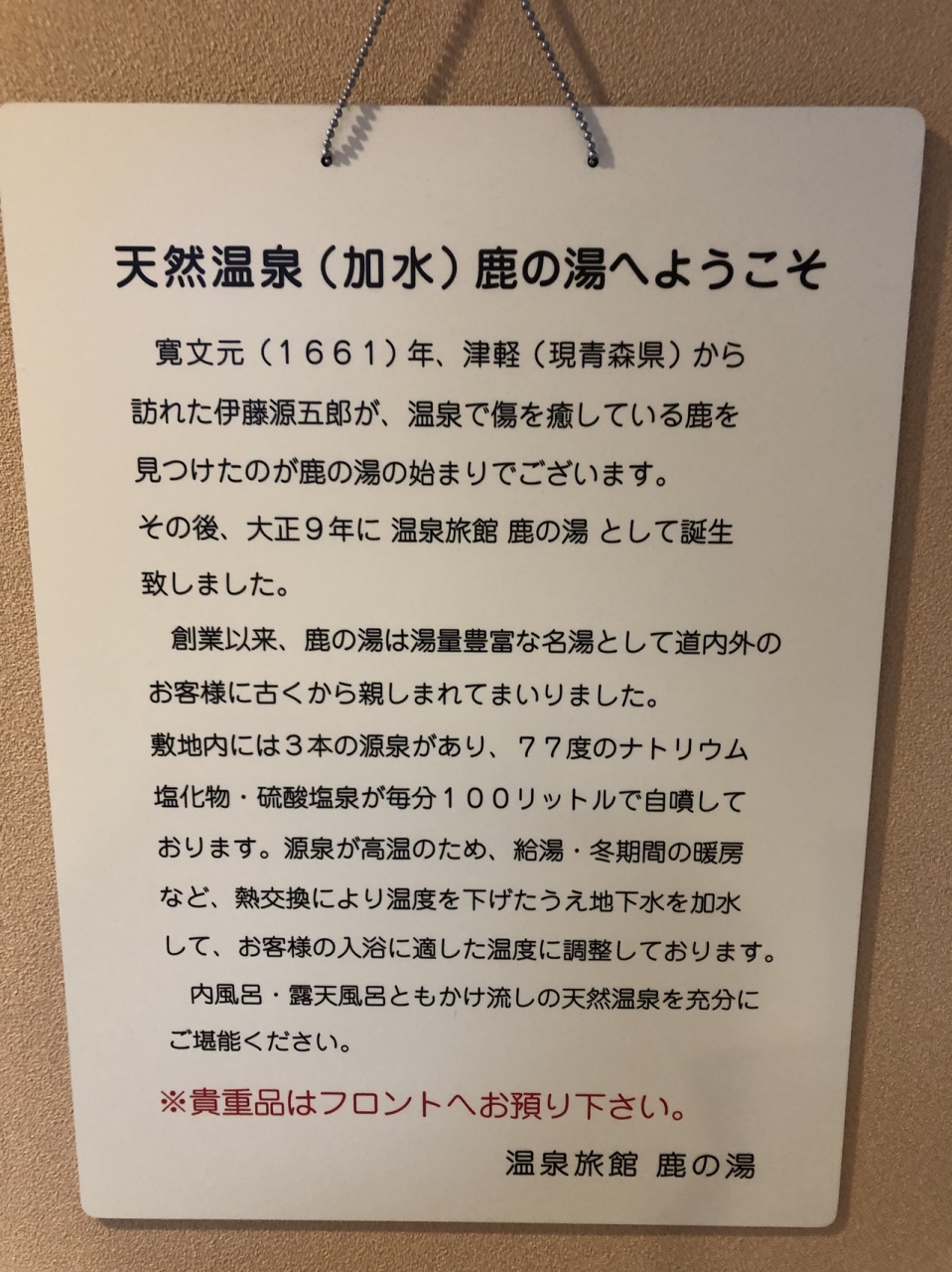 鹿部温泉は名前の由来は、鹿が怪我をしていてこの温泉に浸かっていたことから由来しているようです。源泉は熱いので加水してありますがそれでも熱い温泉です。日帰り施設もあり疲れを癒すことが出来ます。無色の温泉です。