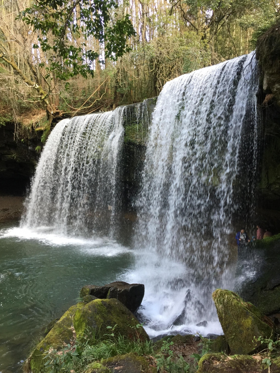 滝の裏側に回ると、カーテンみたいに落ちる水が木漏れ日に照らされて、キラキラときれいで神秘的でした。