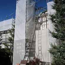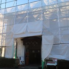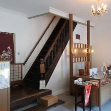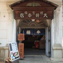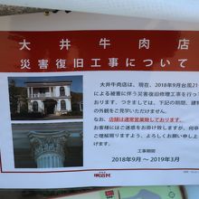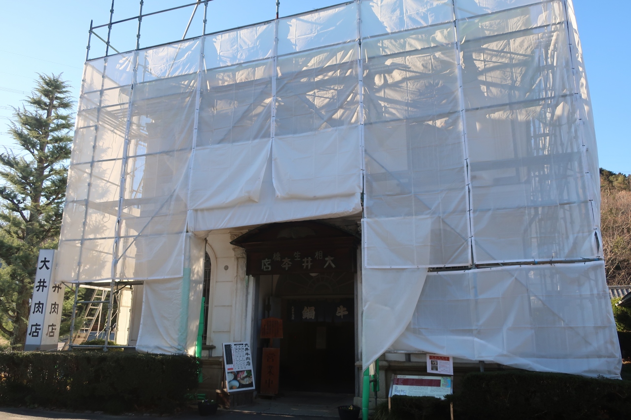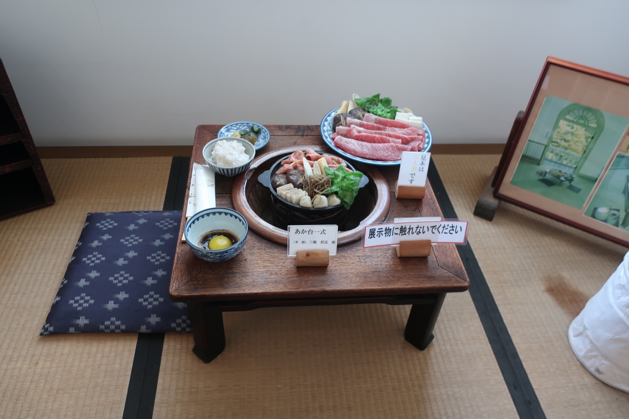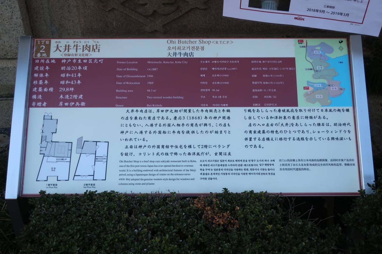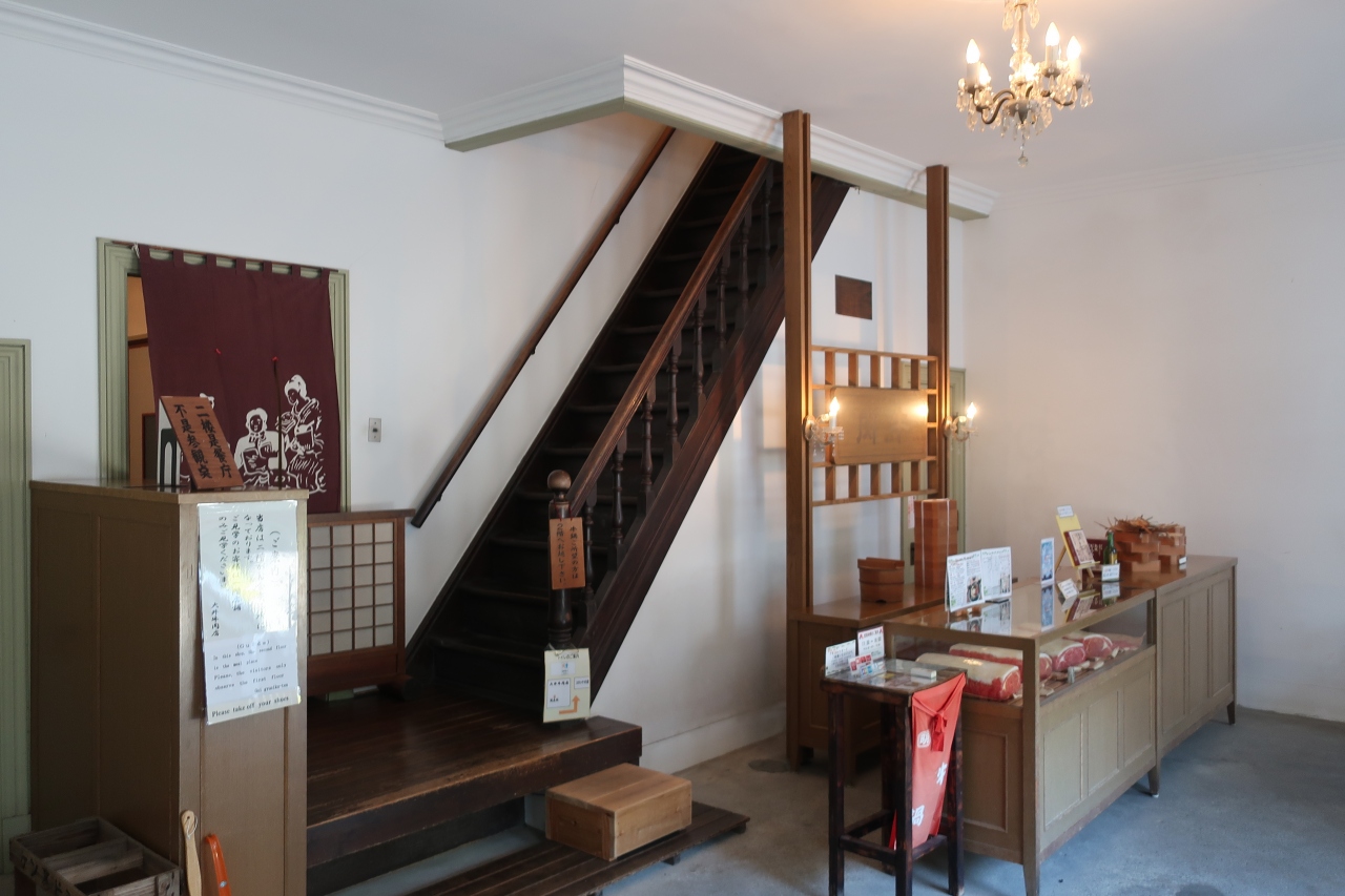 明治村1丁目、表門から入って右手のミュージアムショップの裏側に大井牛肉店はあります。明治20年に神戸元町に牛肉販売・牛鍋料理店として建てられた木造2階建ての洋館です。行ったときは台風による災害復旧工事のため外部は足場が組まれ、見られるのは看板の掛かった入り口と内部のみ。しかし、牛鍋は高くついて手が出ず、1階のみの見学になりました。早く復旧工事が終わって欲しいものです。