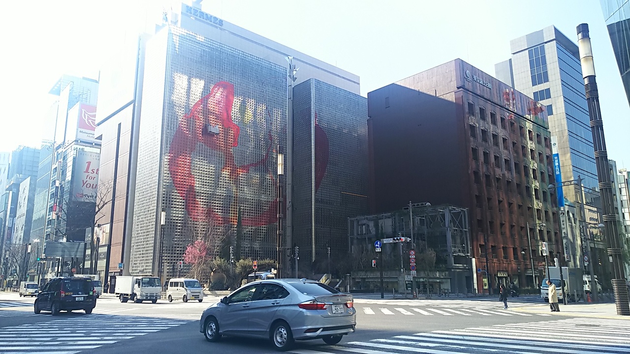 銀座メゾンエルメスの屋上の白馬に乗った騎士を見上げなから数寄屋橋の交差点を渡るのですが、